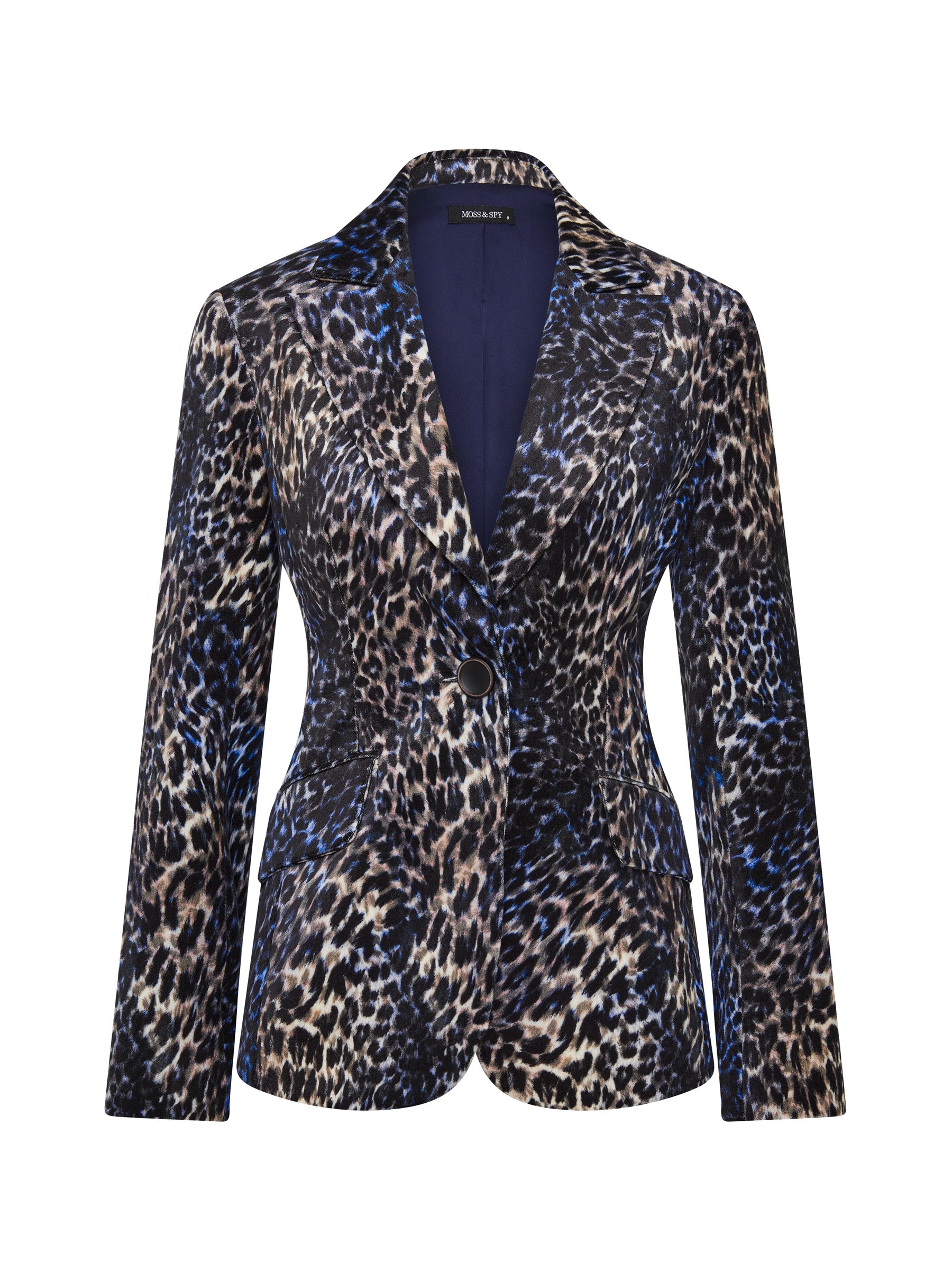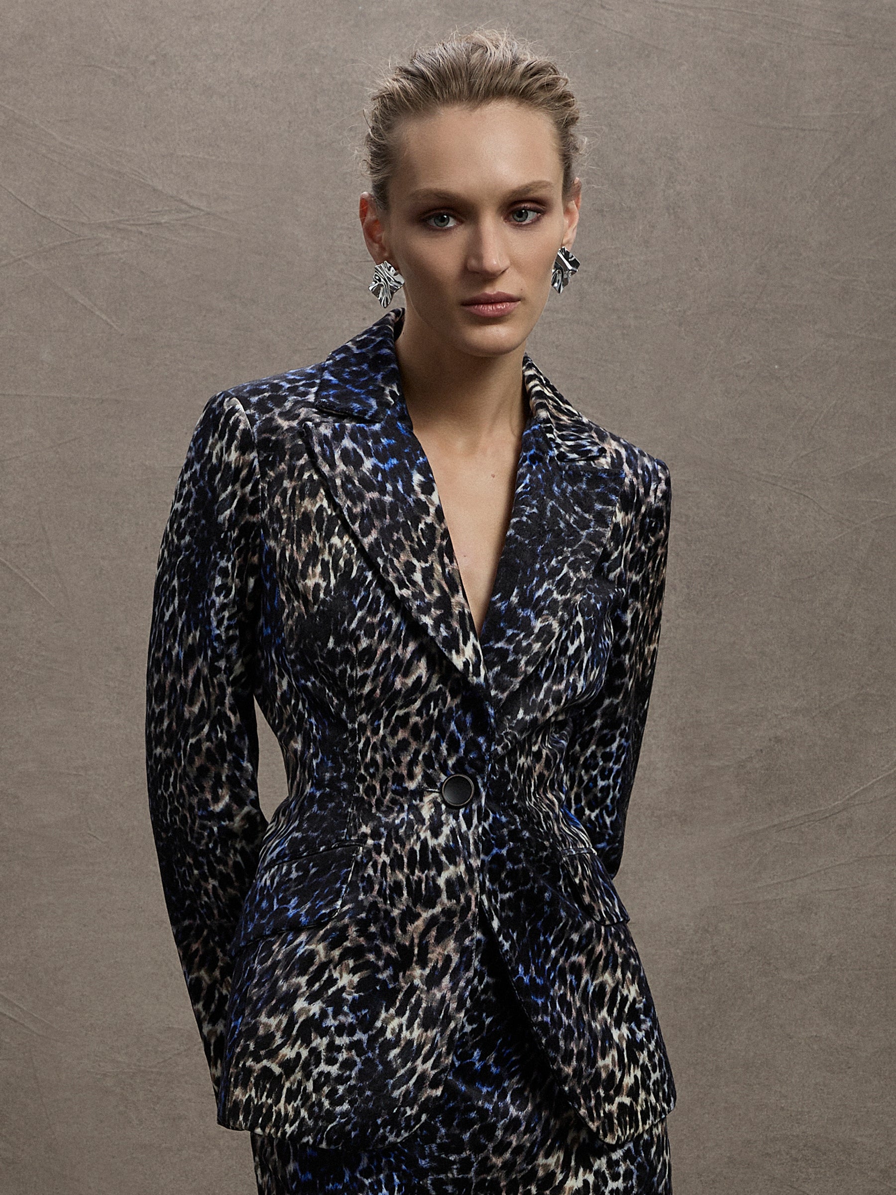The Leo Blazer is tailored from a stretch velvet in a contemporary leopard print with tones of blue, chocolate and cream. Designed with a slim silhouette with peak lapels and functional jet pockets, features padded shoulders for added structure, creating a beautifully tailored look. The single-breasted design is secured with a button fastening through centre-front and is fully lined with stretch satin to ensure it can be smoothly layered over tops. A timeless piece with versatile styling options to be worn for years to come. Pair yours with the matching Leo Pant for a sophisticated look.