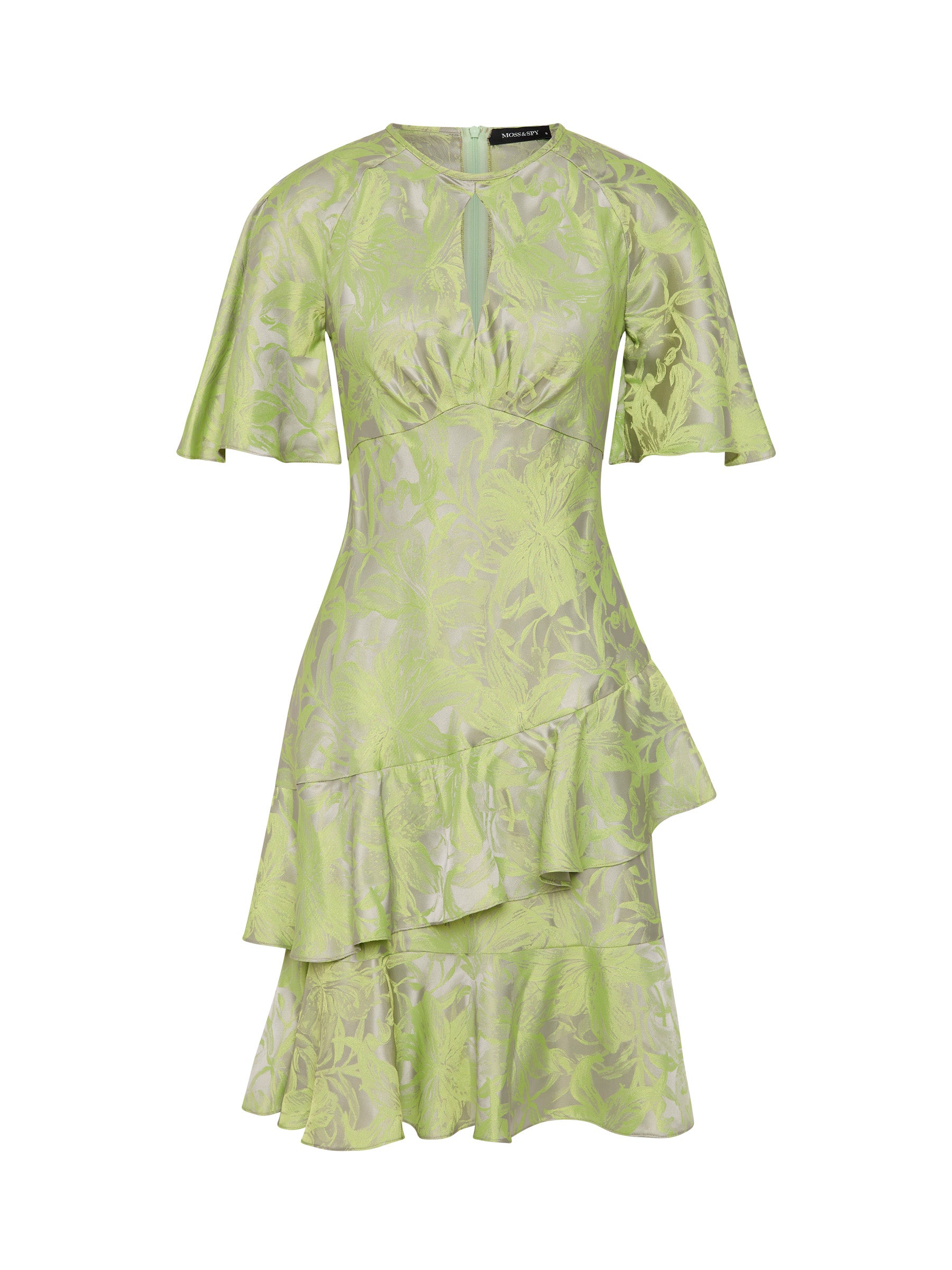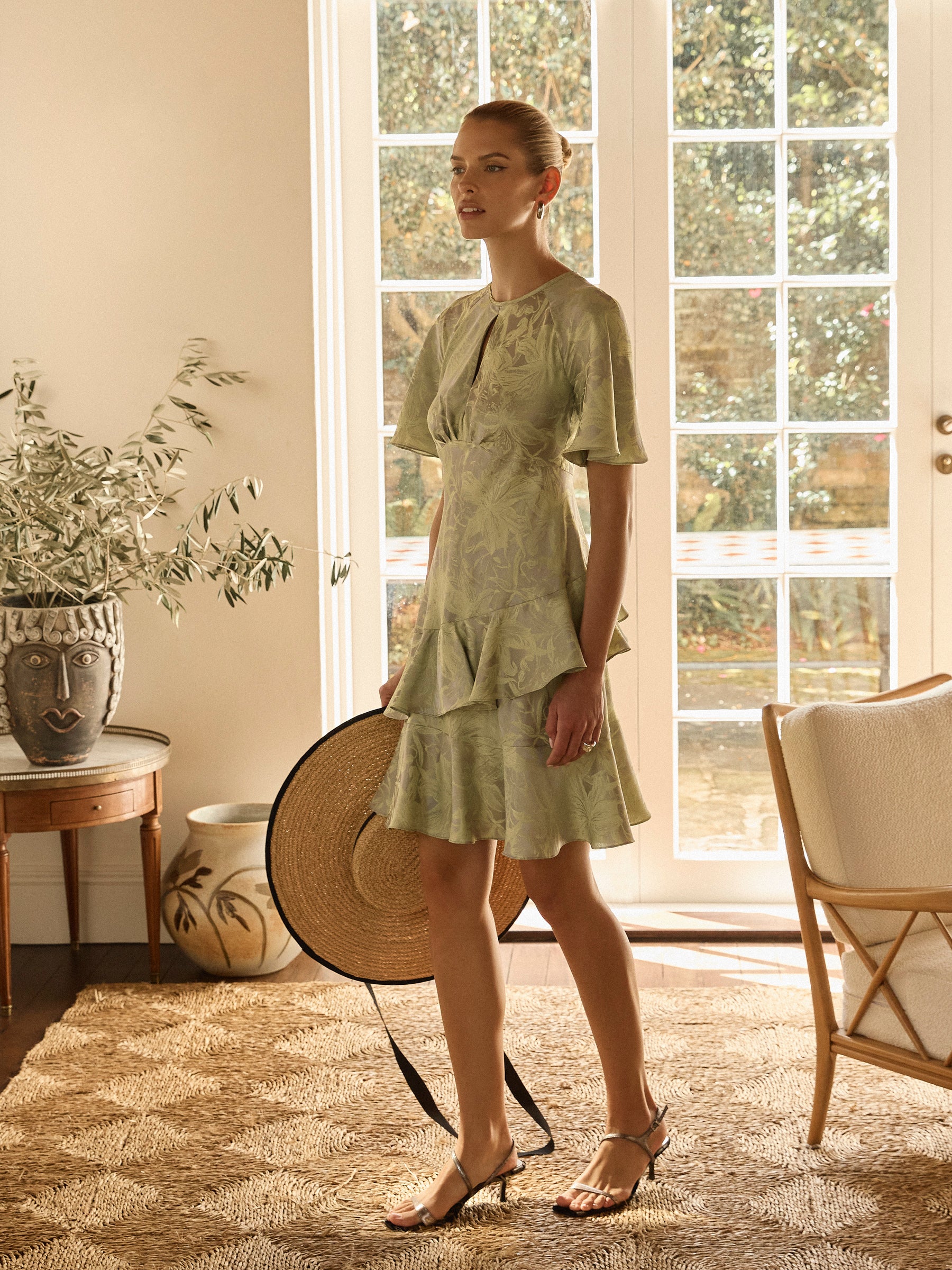 Effortlessly elegant, the Lolita Short Dress is crafted from a two-tone draped jacquard with a vibrant citrus floral design on a silver-grey background. A keyhole neckline and under bust seam sculpt the bodice, flowing to a gentle A-line silhouette. The layered flounce hem and flounce sleeves add a soft, feminine touch to this elevated style. Perfect for garden parties or evening events, the Lolita Short Dress will make a lasting impression.