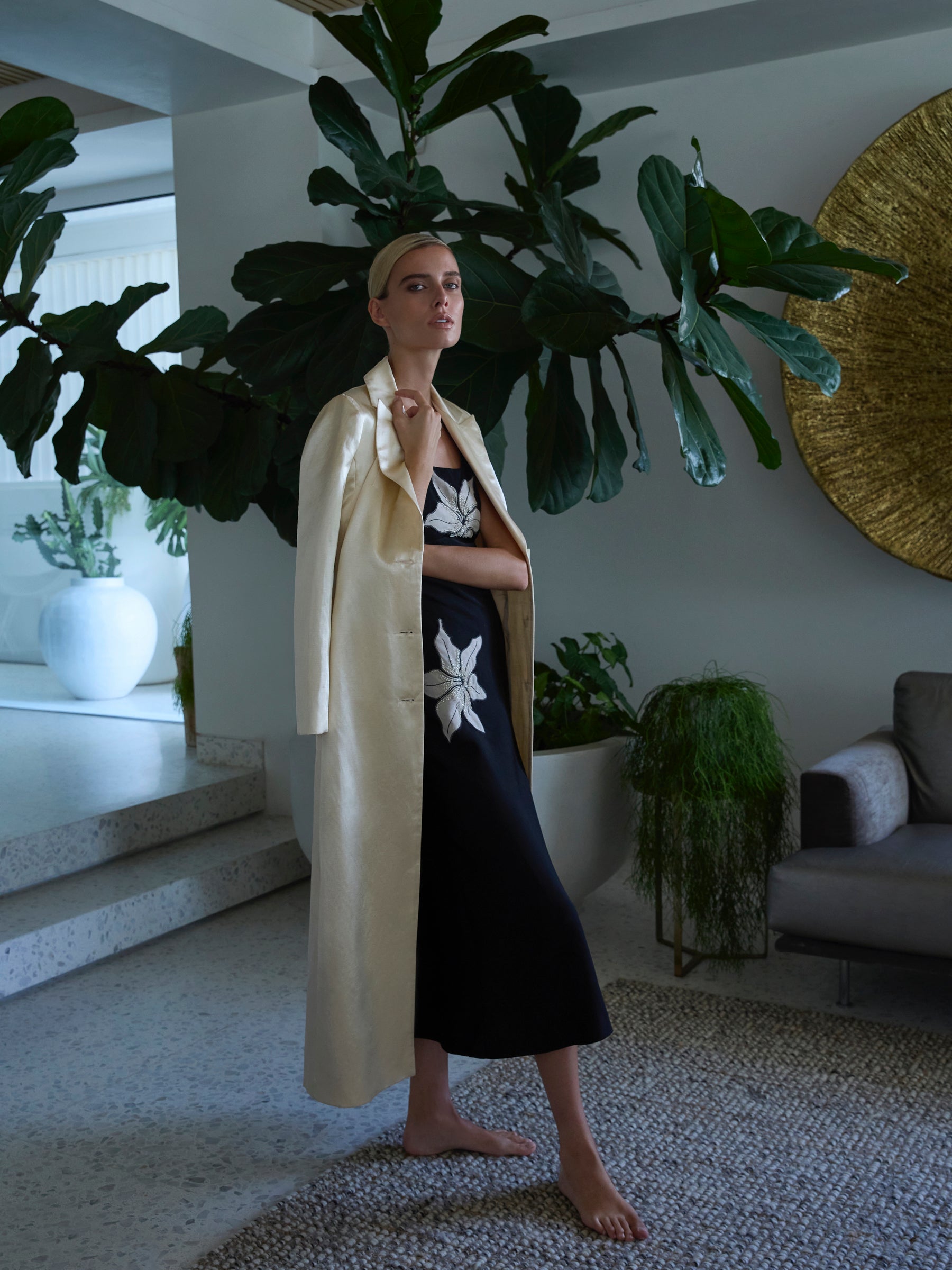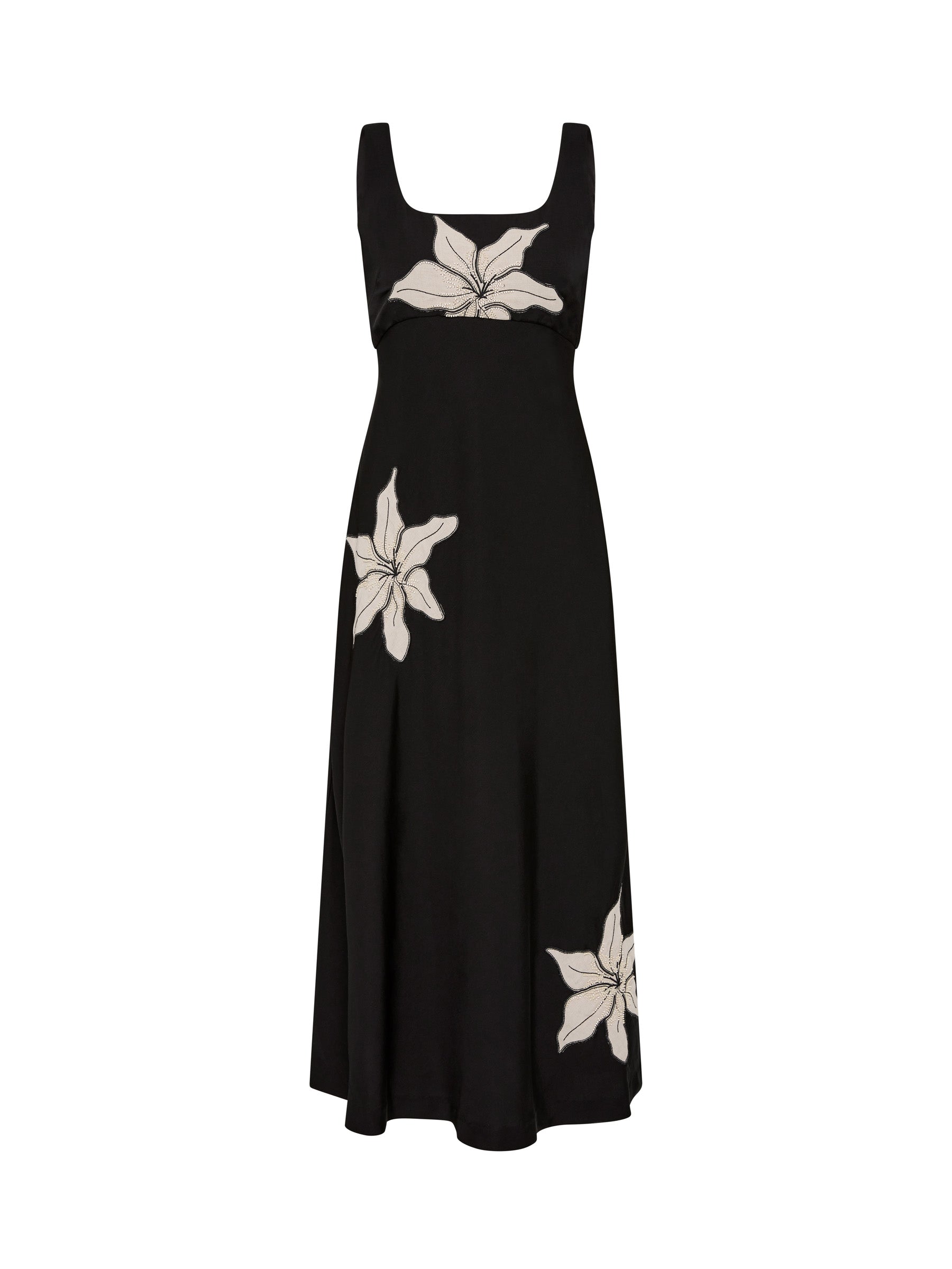 Elegant and versatile with a classic silhouette, the Nikita Midi is designed to effortlessly transition from daytime occasions to evening events. Featuring cream toned floral embroidered appliqué and delicate beaded motifs on black linen viscose, it has a squared neckline and an under bust seam falling to a slight A-line silhouette. The Nikita Midi is cut on the bias to allow for a slight flare, fully lined in a stretch satin and features a centre back invisible zipper, for a refined, feminine finish.