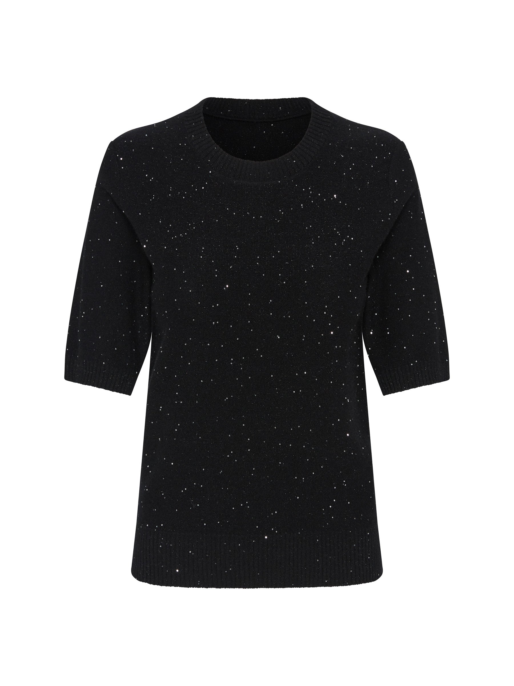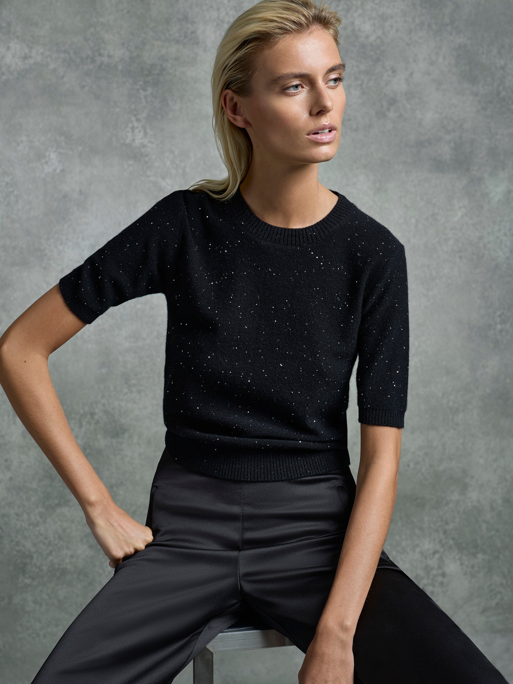 Knitted from 100% Cashmere this luxuriously embellished short sleeve sweater is the perfect statement knit to layer with your winter wardrobe. Soft to touch, it is embedded with micro sequins to give a distinctive yet subtle sparkle. Designed to be a relaxed slim fit it can be worn over pants or skirts, finishing on the hip.