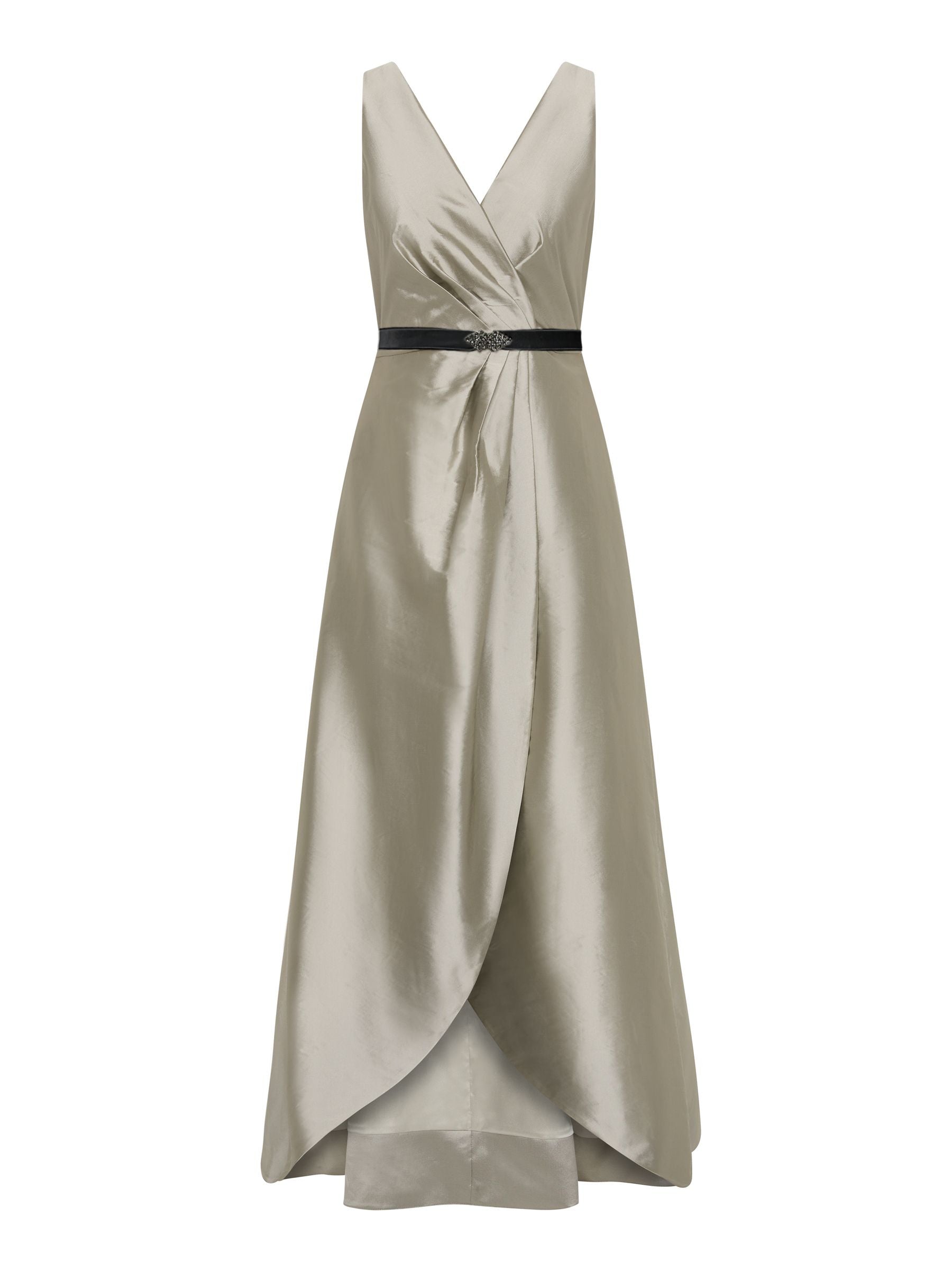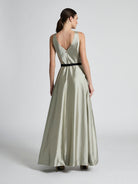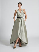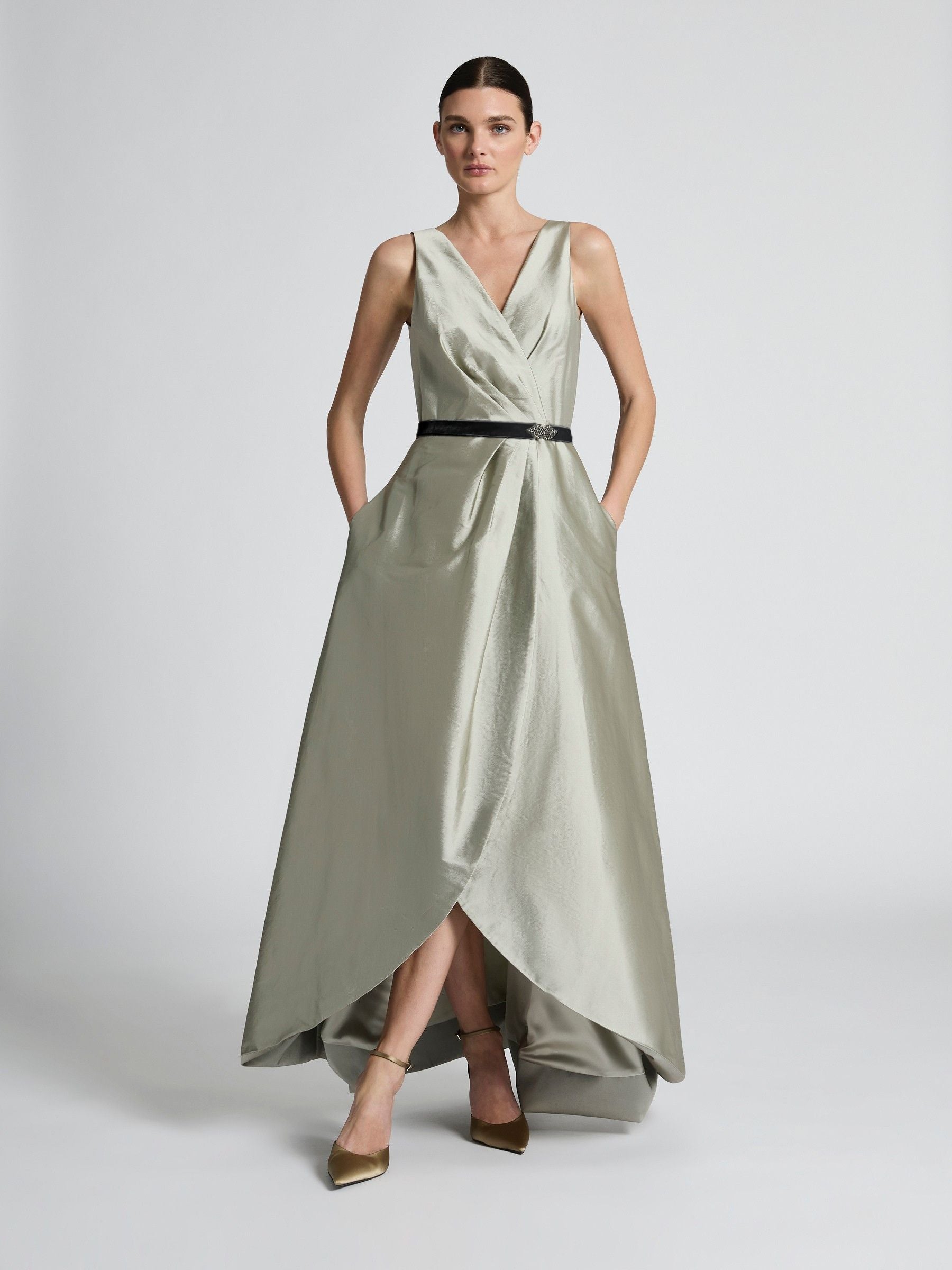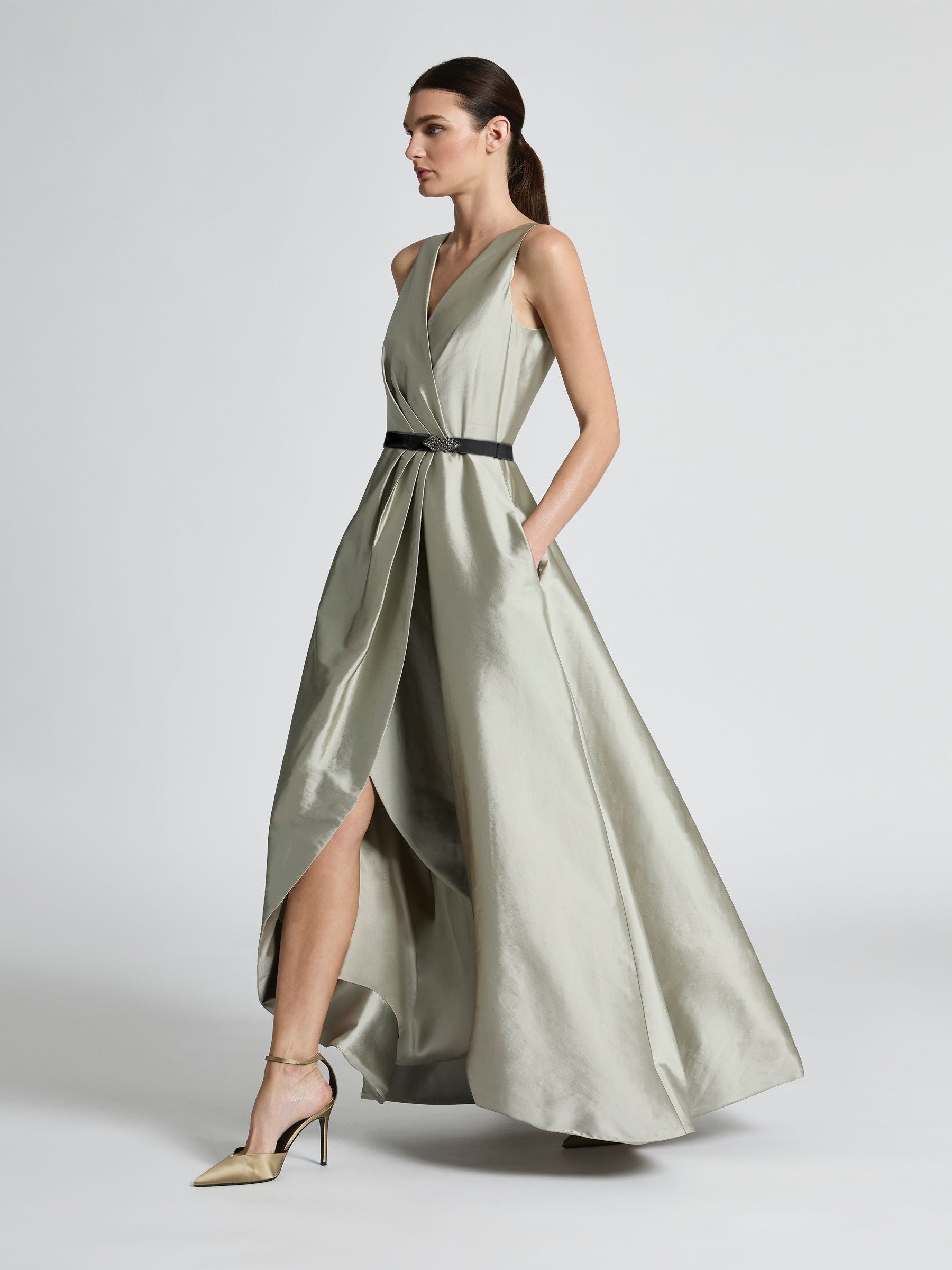 The Beatrice Gown is crafted from luminous shot taffeta in a steel metallic hue with subtle green-khaki undertones. Designed with a mock wrap V-neckline and dramatic high-low hem, it catches the light beautifully. Finished with a removable embellished velvet belt, it’s ideal for black-tie events, formal evenings and special celebrations.