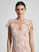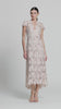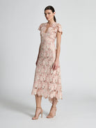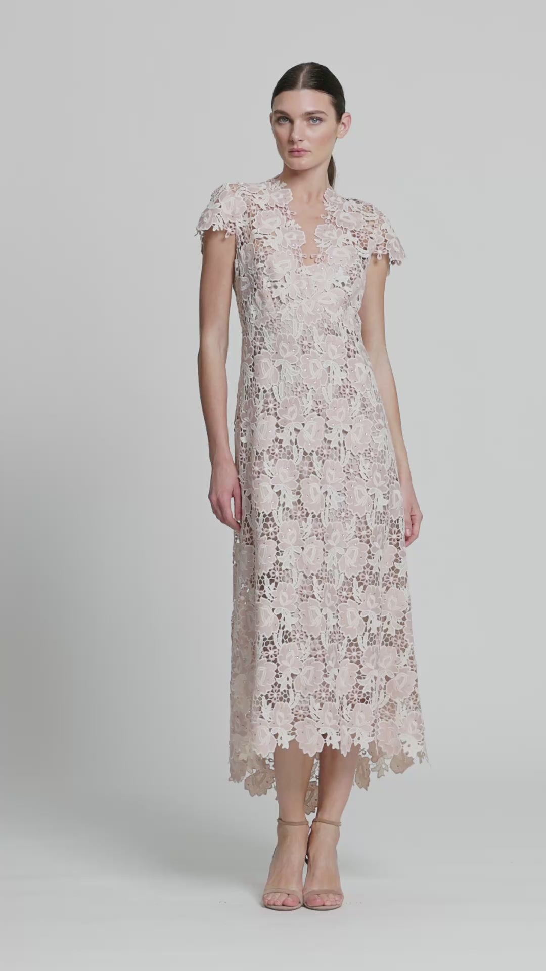 The Belinda Dress is an elegant midi dress crafted from intricate guipure lace with a two-tone dusty pink and cream colouring and delicate diamante detailing. Featuring a flattering V-neckline, scalloped cap sleeves and soft A-line skirt, it’s ideal for weddings, formal luncheons and special daytime events.