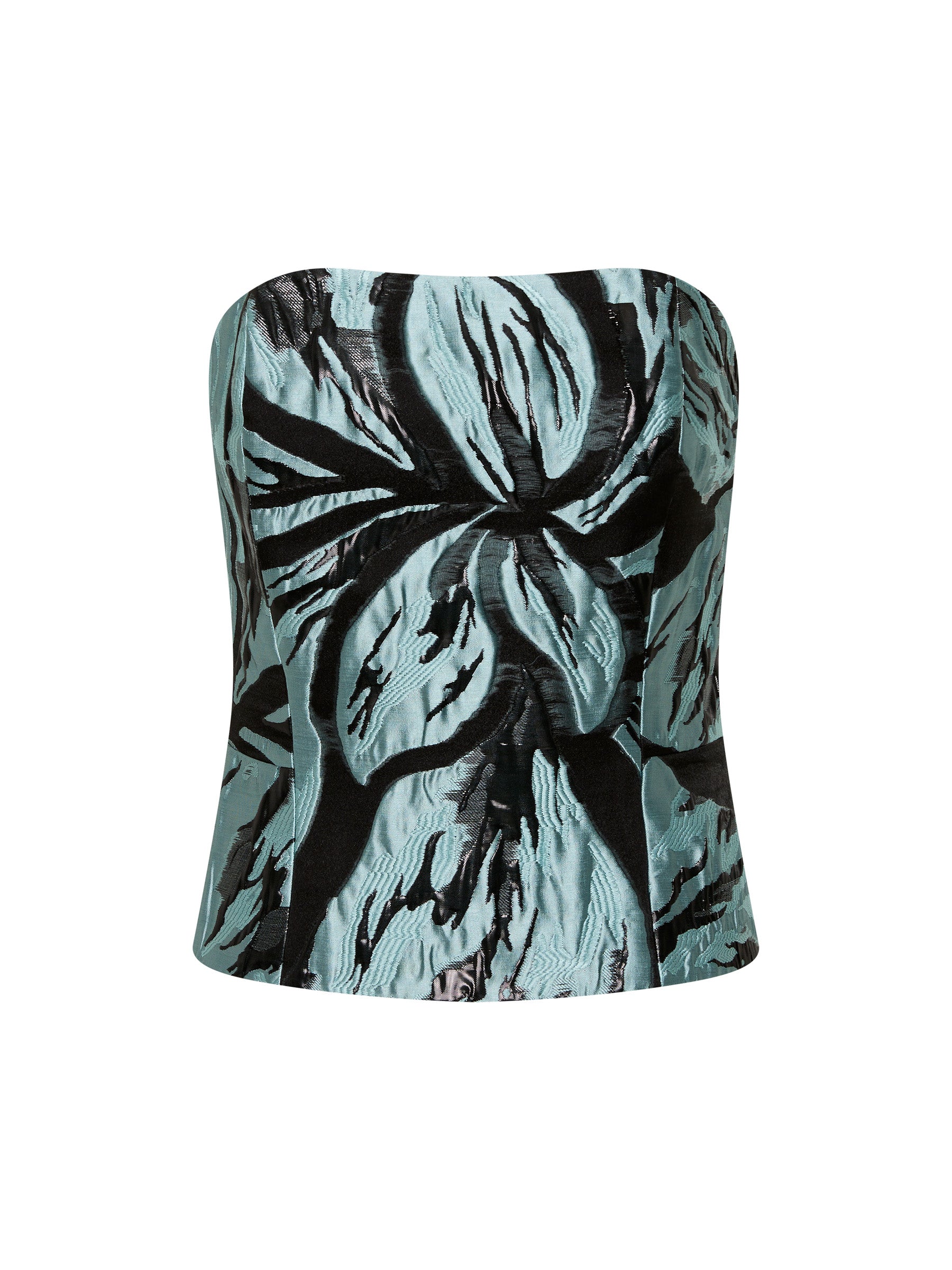 The Bella Bustier is a true statement piece, featuring a mint blue floral design with subtle metallic highlights, crafted on a contrasting black organza jacquard. This strapless bustier is fully lined and structured with boning through the bodice to create a fitted silhouette. Pair with the Rene Skirt for an effortlessly bold look, perfect for any cocktail event.
