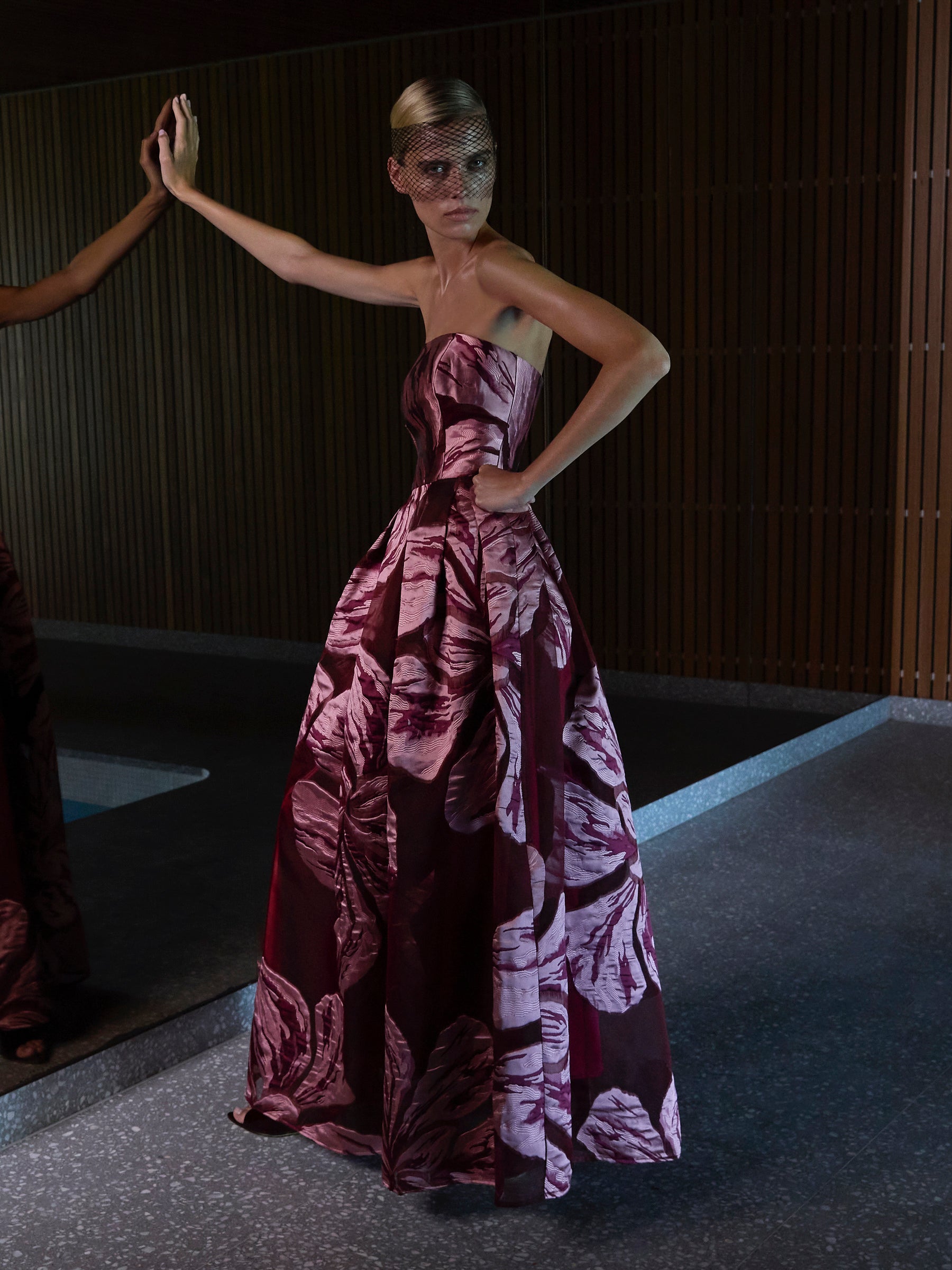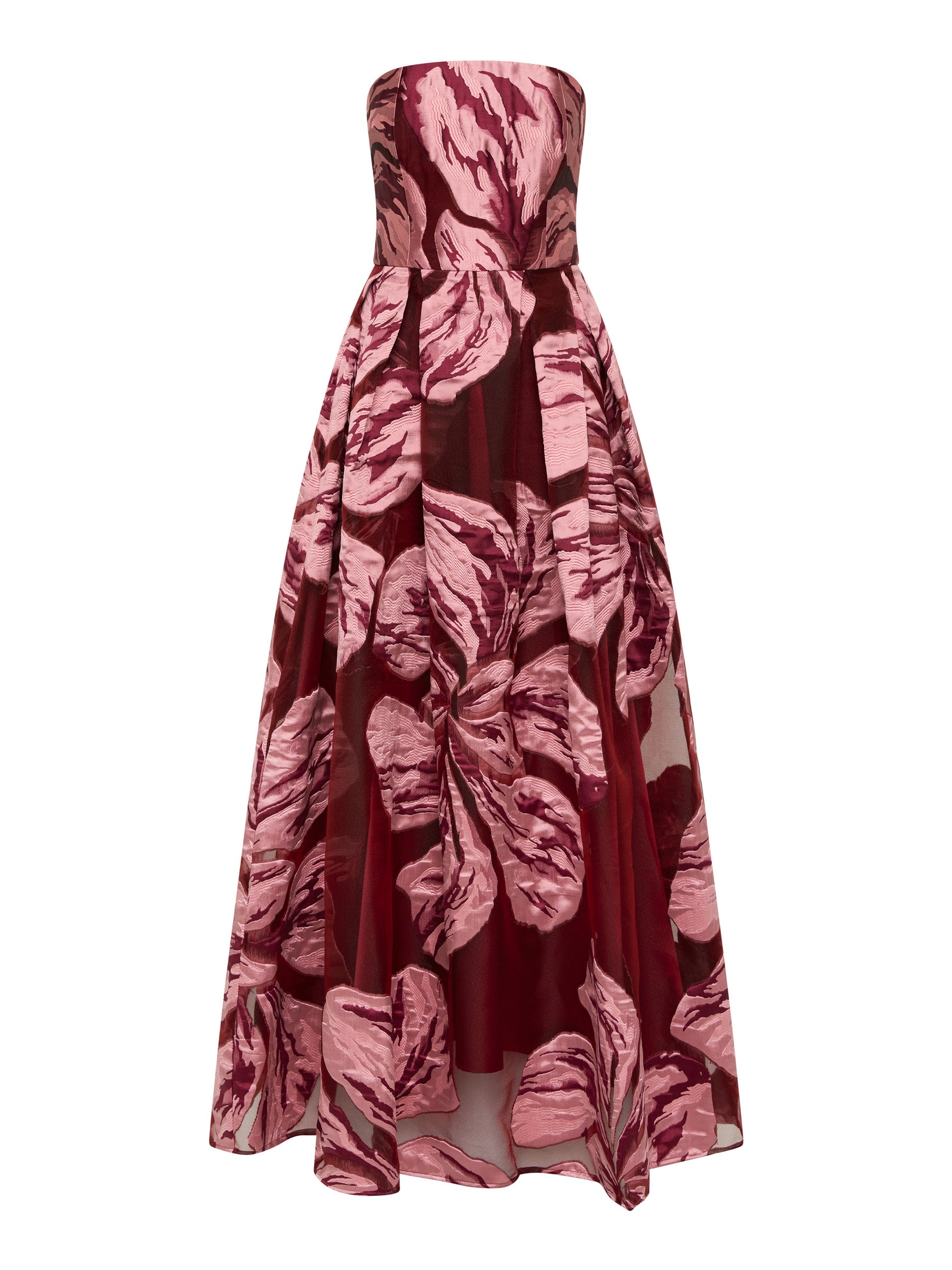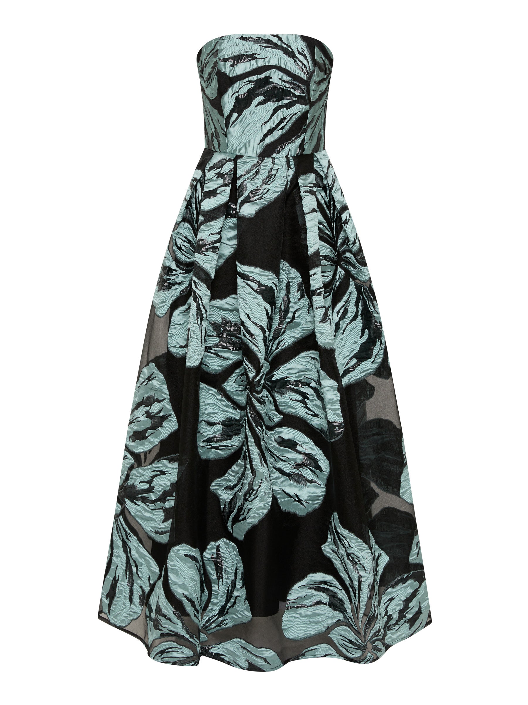 Be the Belle of the Ball in the Bella Gown. Crafted from an organza jacquard with a contrasting floral design, meticulously placed to flatter the body. Fitted through the bust and waist, enhanced with boning in the bodice for structure falling to a maxi length tucked A-line skirt, fully lined in a matching satin.