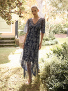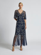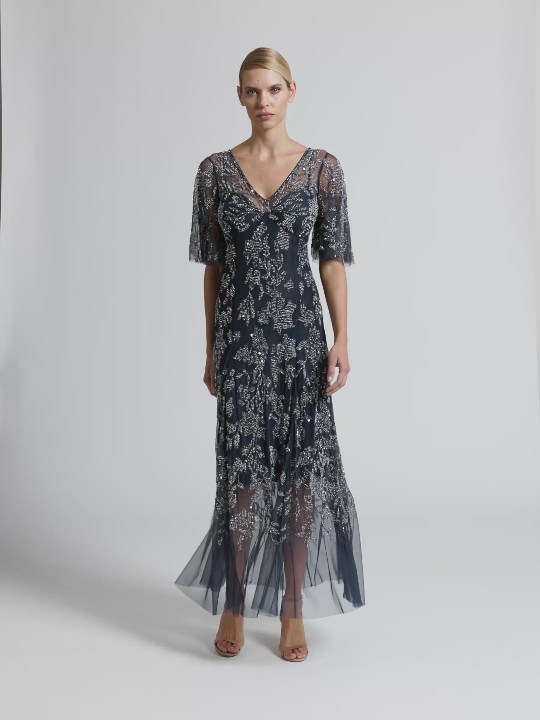 The Desiree Gown has been intricately embroidered and hand beaded on a navy tulle. It features romantic floral motifs in tones of blush pink and pale blue. This gown is designed to be fitted through the body with an under-bust seam, falling to a flowy, full hemline. Timeless and elegant, the soft, elbow length flounce sleeve makes it perfect for formal events or weddings all year round.
