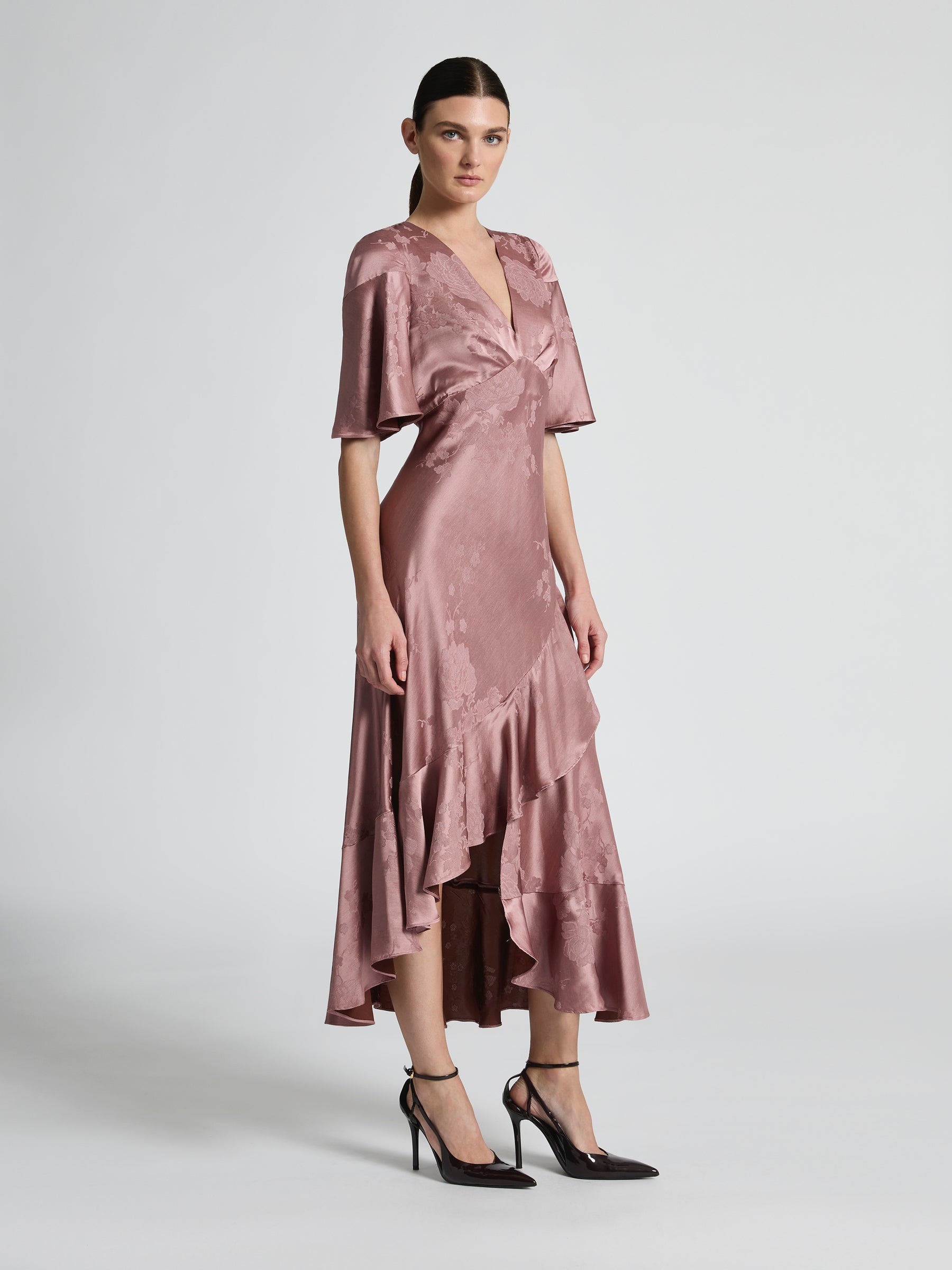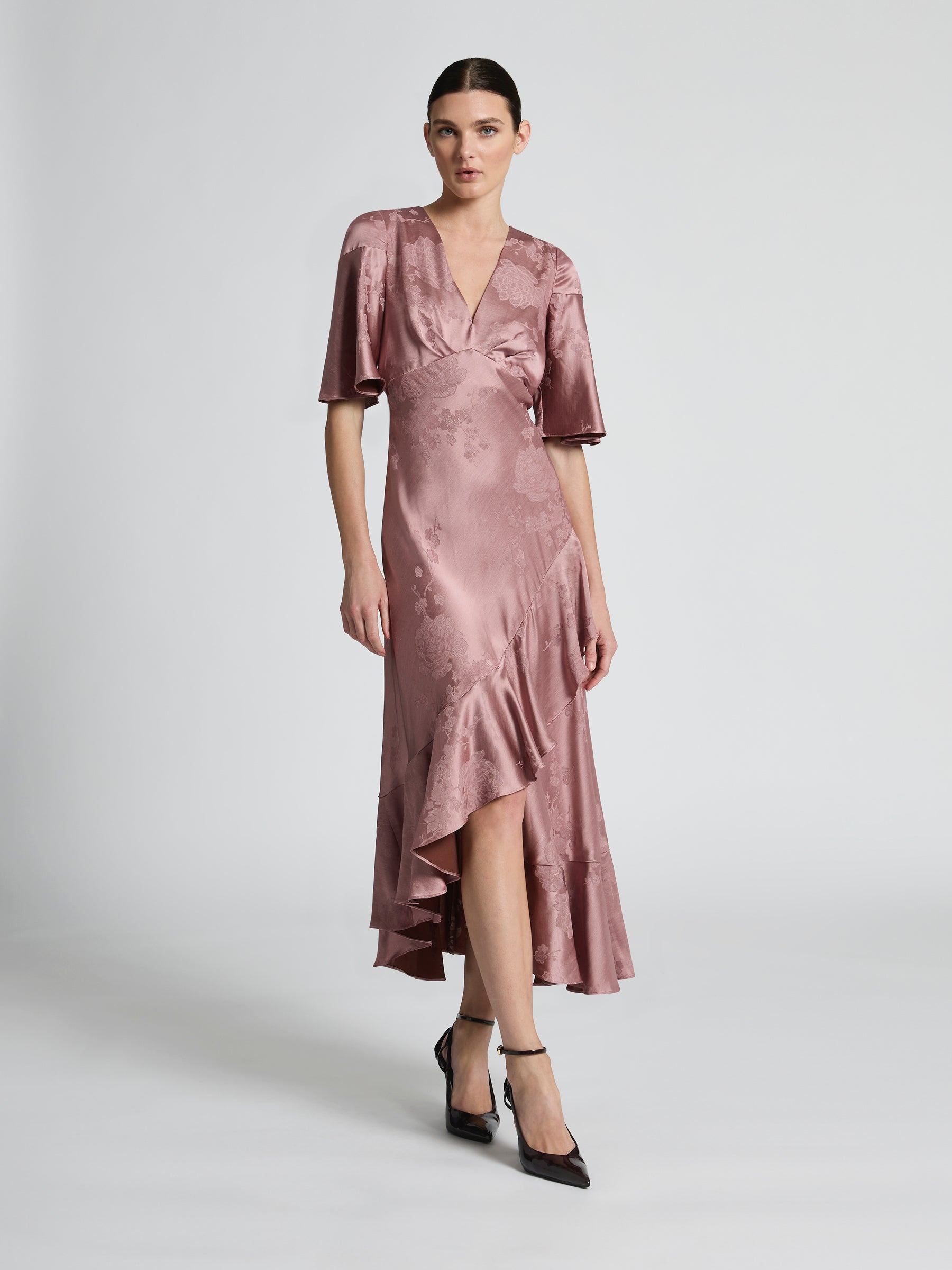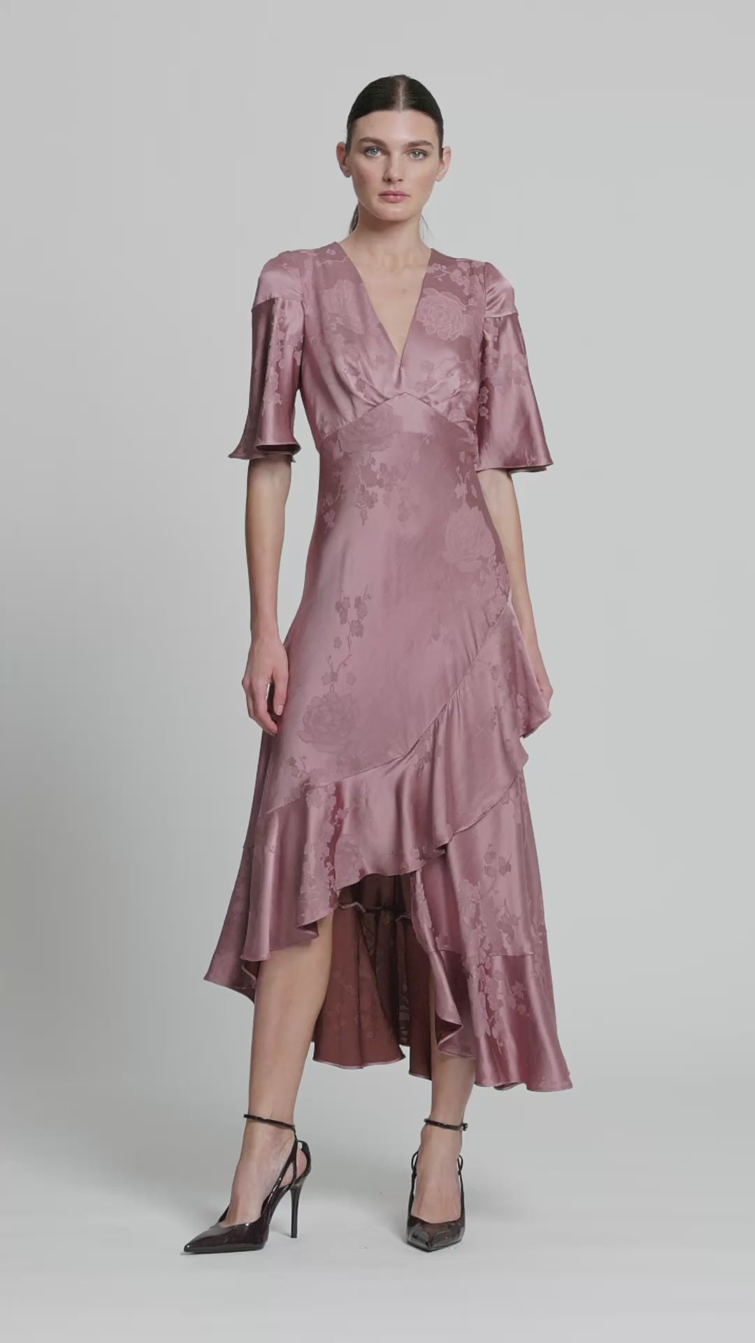 The Gisele Flounce Sleeve Midi Dress offers a refined balance of femininity and movement. Crafted from satin-finish jacquard with a sculptural spiral hem, it features soft flounce sleeves and a flattering V-neckline. Wear to cocktail events, garden parties or elevated daytime occasions.