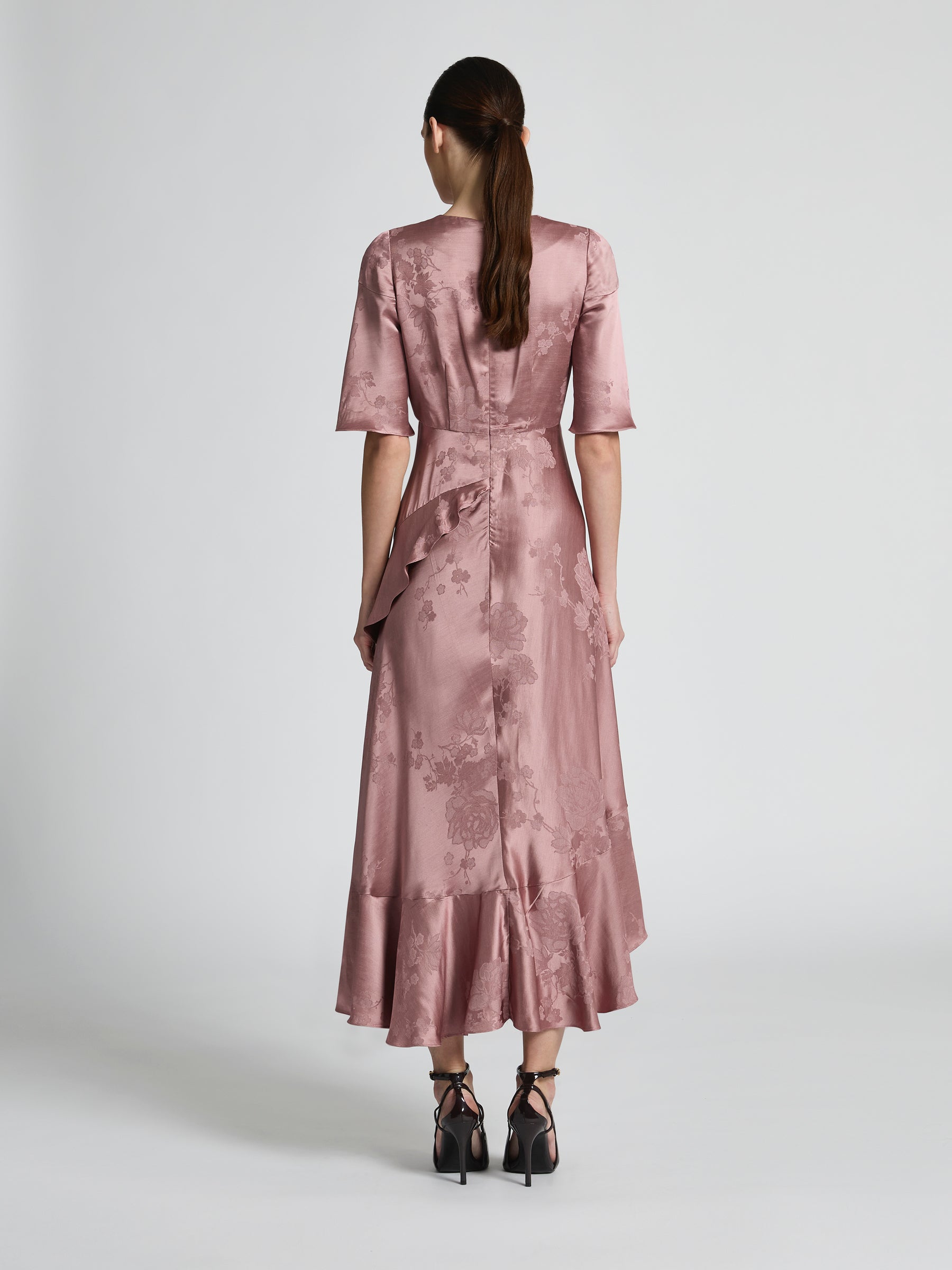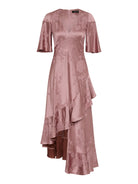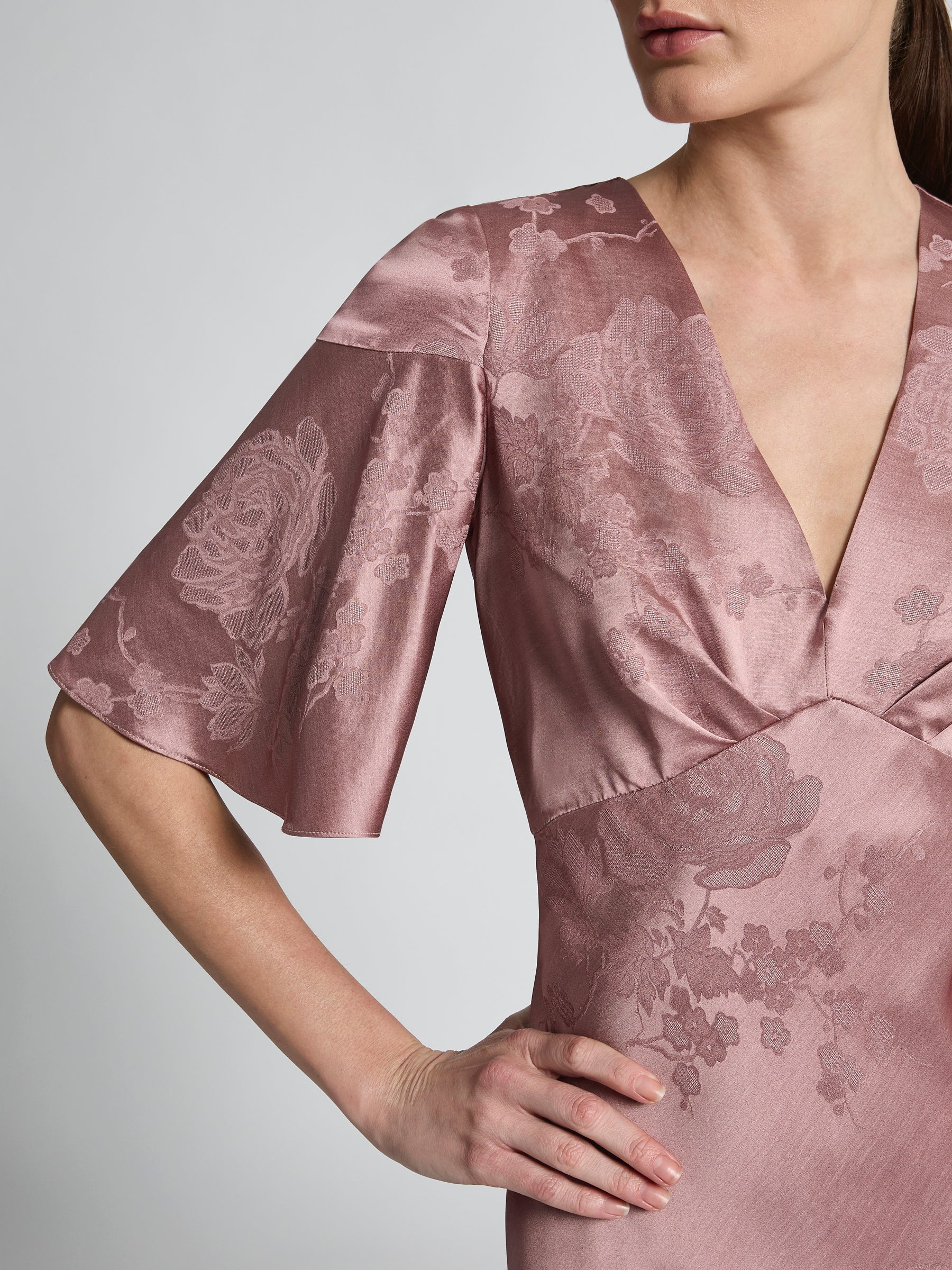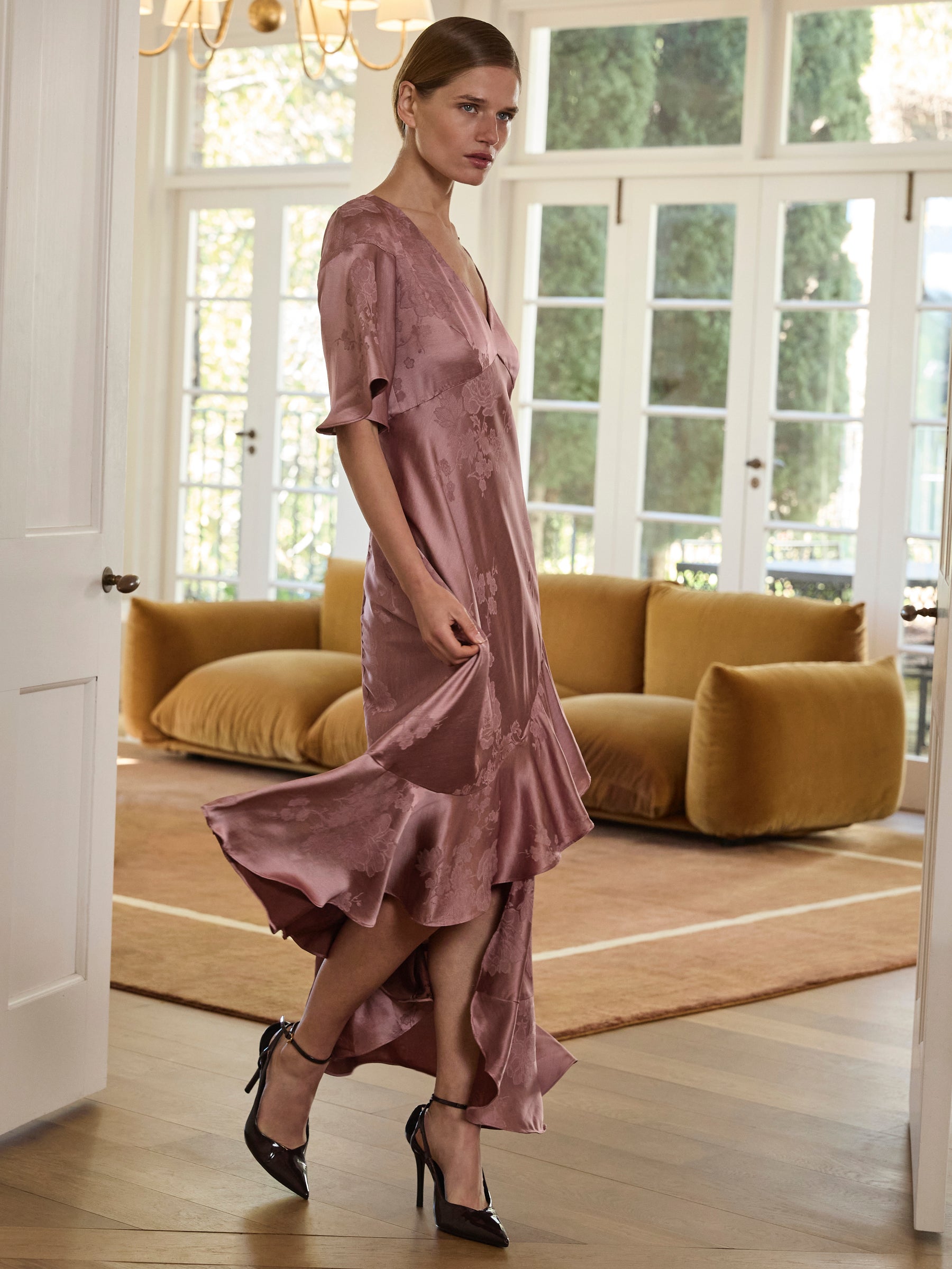 The Gisele Flounce Sleeve Midi Dress offers a refined balance of femininity and movement. Crafted from satin-finish jacquard with a sculptural spiral hem, it features soft flounce sleeves and a flattering V-neckline. Wear to cocktail events, garden parties or elevated daytime occasions.