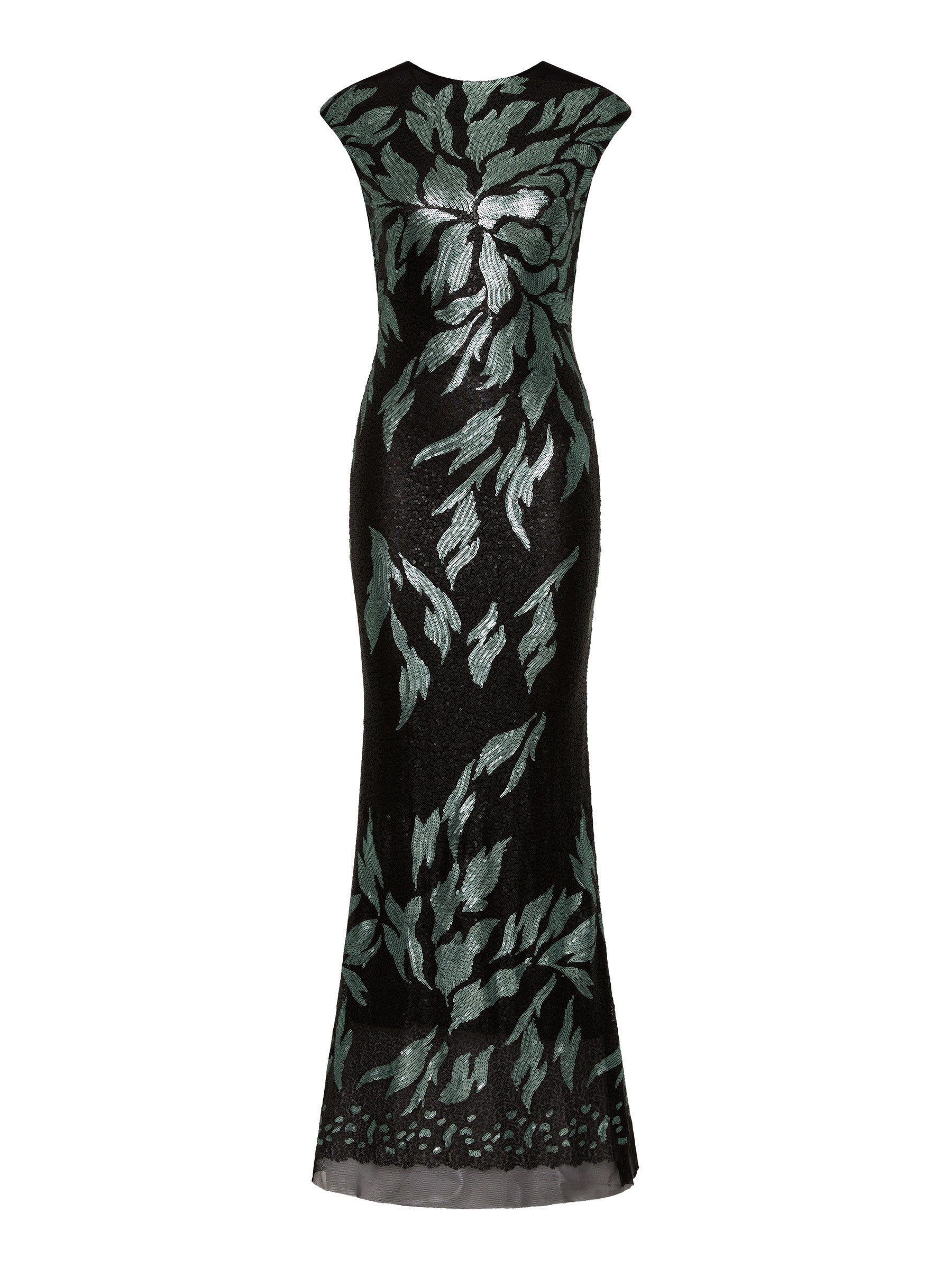 The Larissa Gown has a stunning mint floral design in sequins on stretch mesh which is fitted to the body as a figure flattering silhouette. Featuring a round neckline and cap sleeves, it falls to a slight A-line shape, finishing at maxi length with an open mesh hemline. A sophisticated showstopper for your next formal or black-tie event.