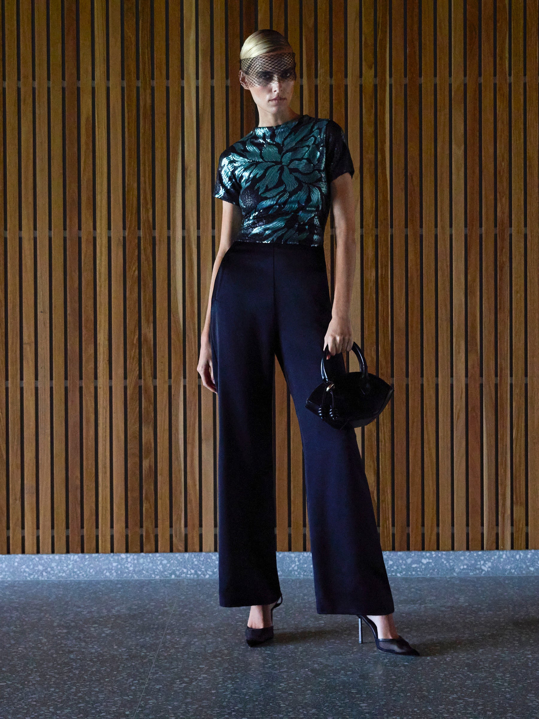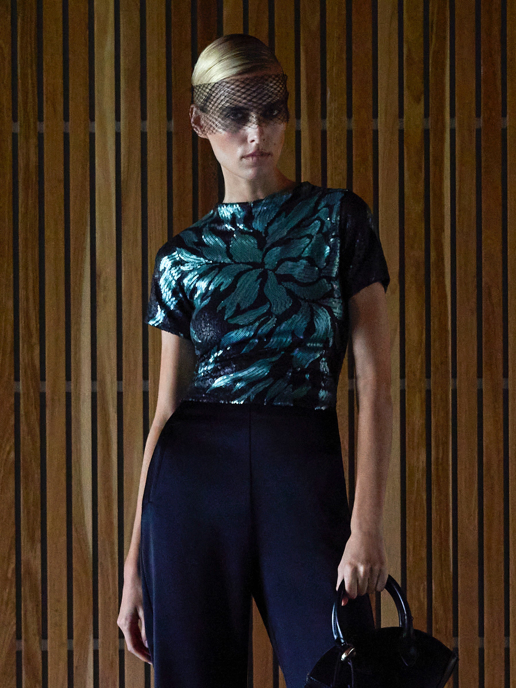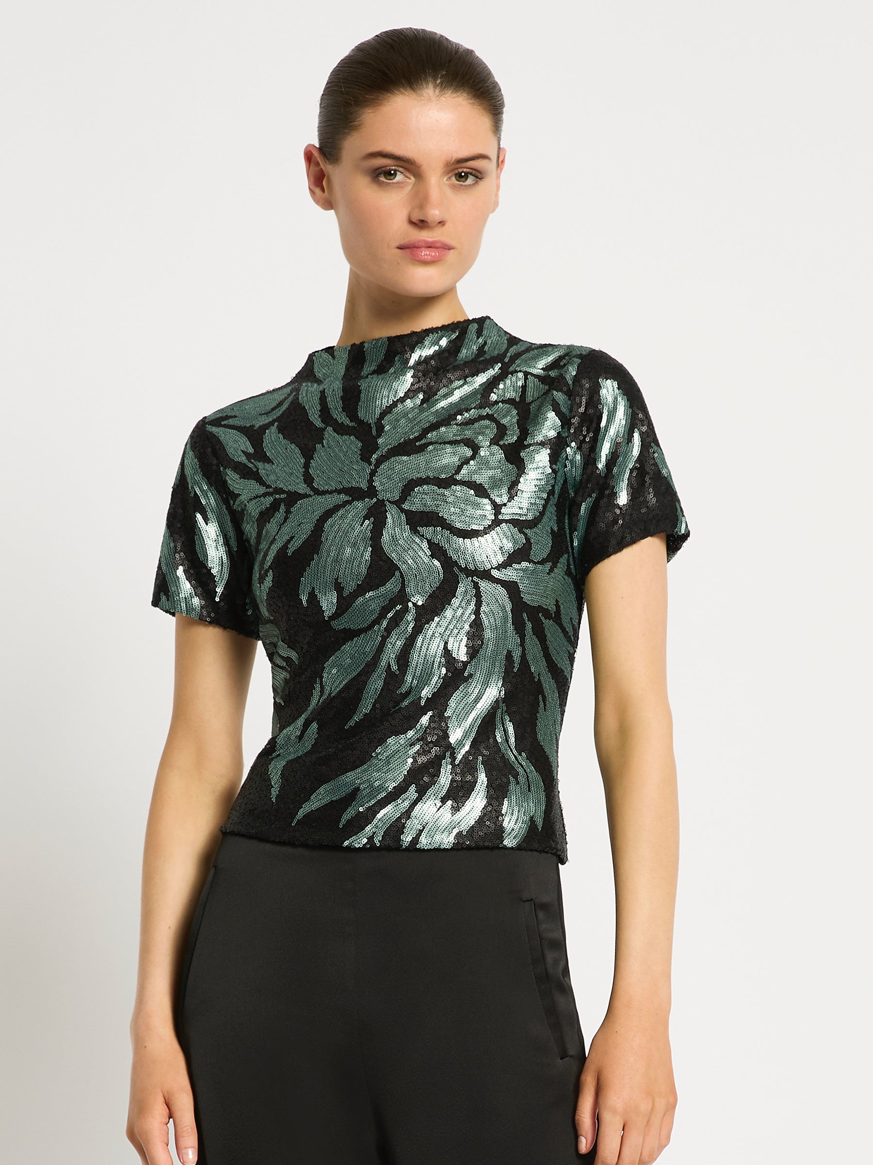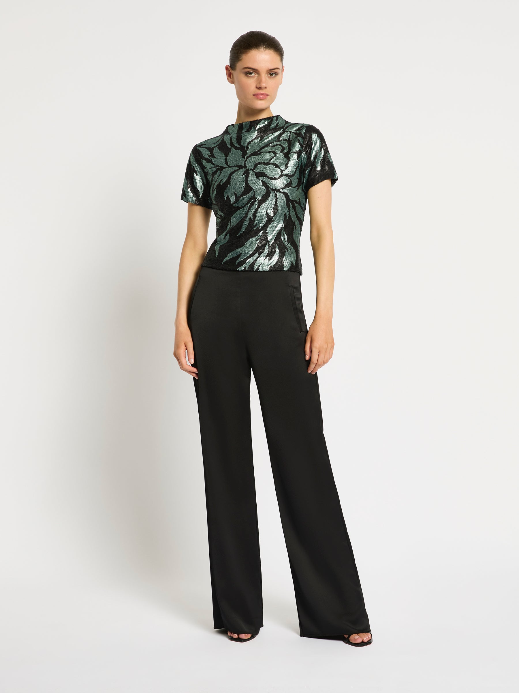 The Larissa Top has a stunning mint floral design in sequins on a stretch mesh, meticulously placed to flatter the body. Fitted to the body with short sleeves and a slightly extended neckline, designed to finish just below the waist and featuring loop and button closure and a concealed zip at centre back. Beautifully finished with mesh lining, pair the Larissa Top with the Rachel Pant or Rene Skirt for a sophisticated showstopper.