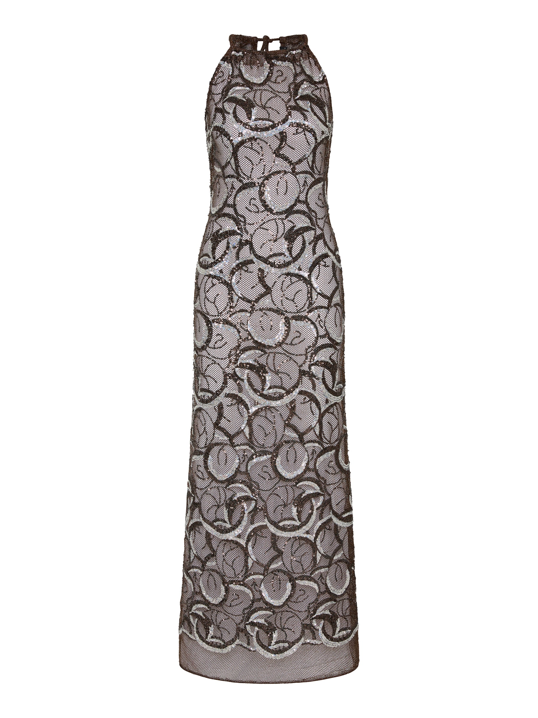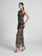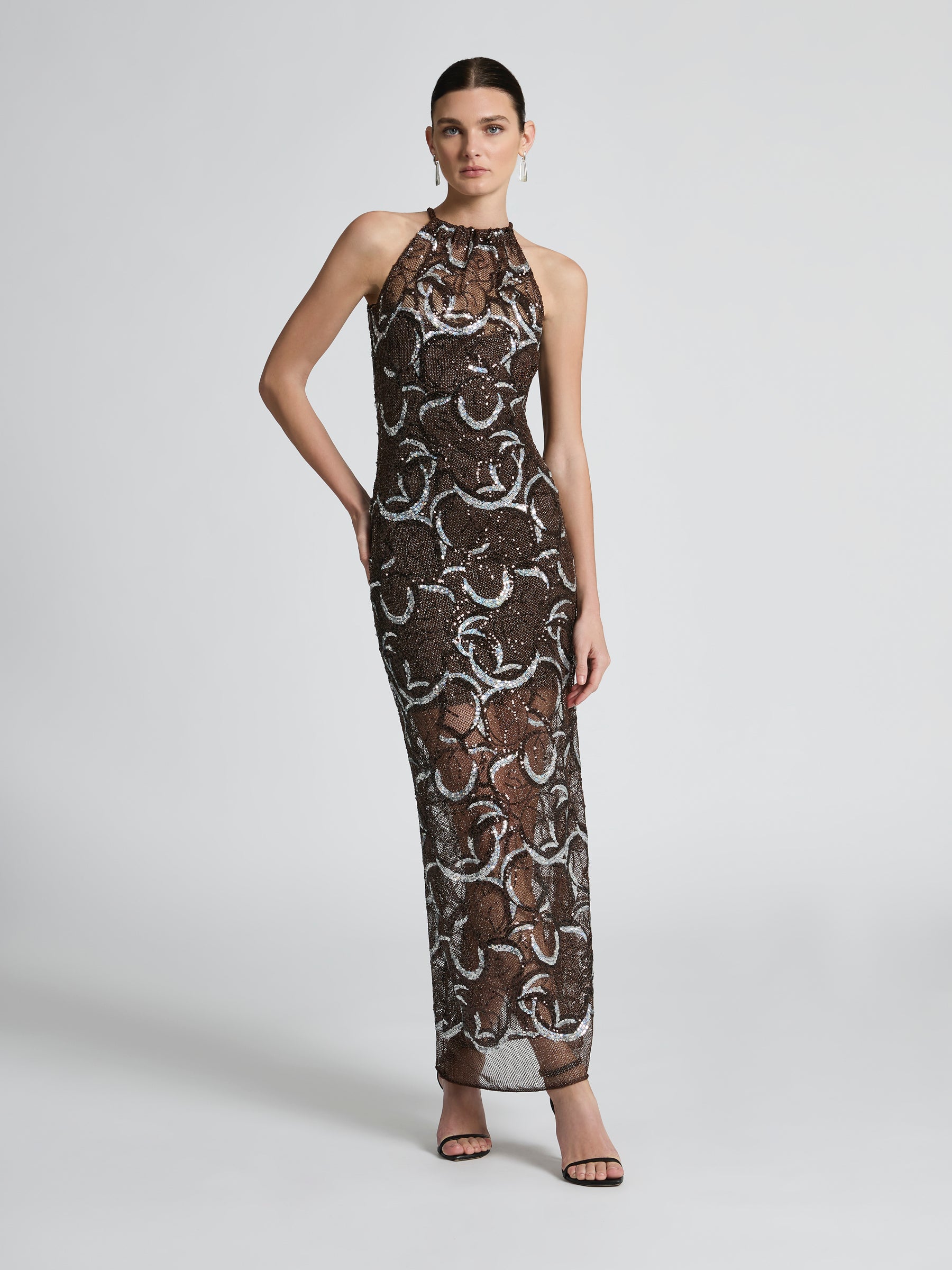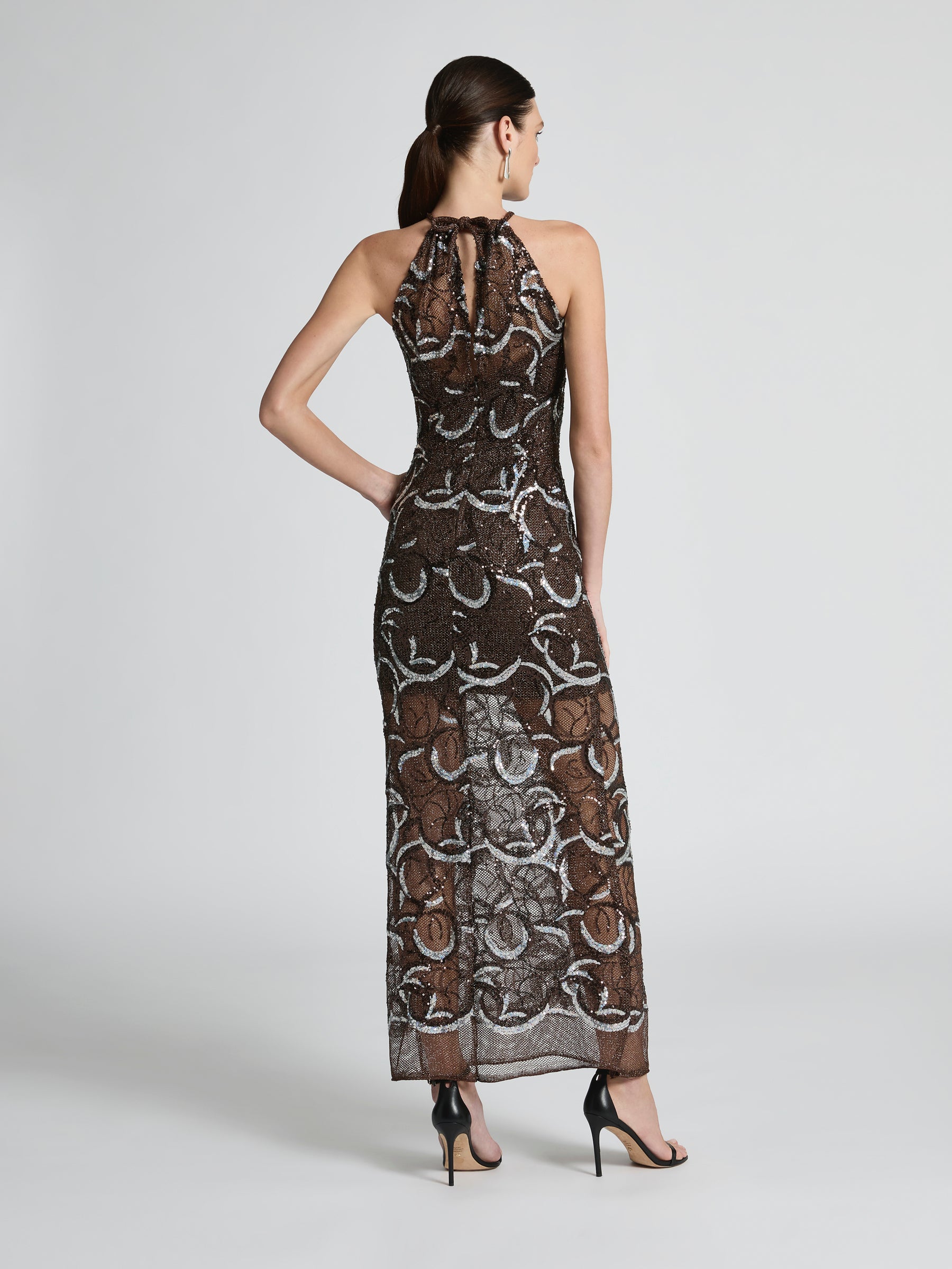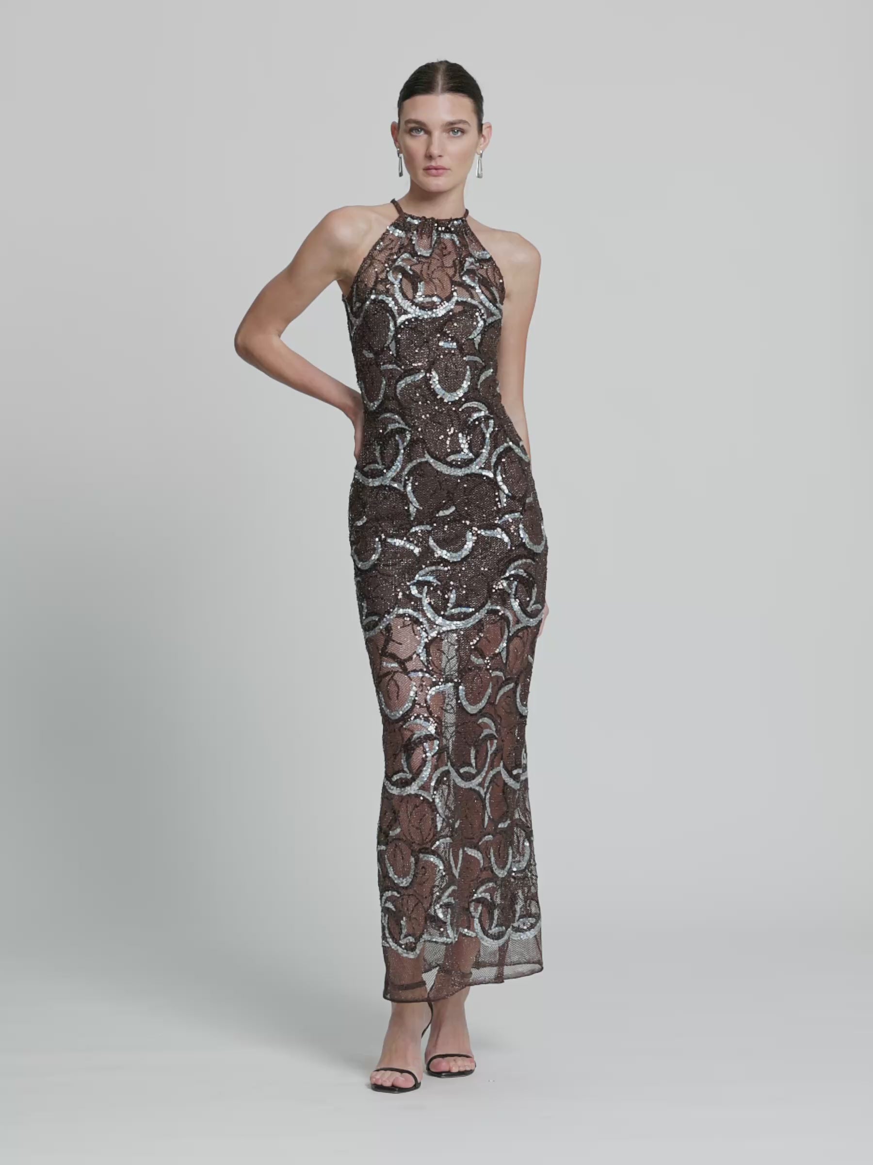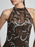 Designed to command attention, the Monique Gown is a modern Studio 54 glamour. Sequin metallic netting fabric shimmers in rich chocolate brown and black tones, accented with striking silver accents. This floor-length gown is made for formal weddings, milestone celebrations and unforgettable entrances.