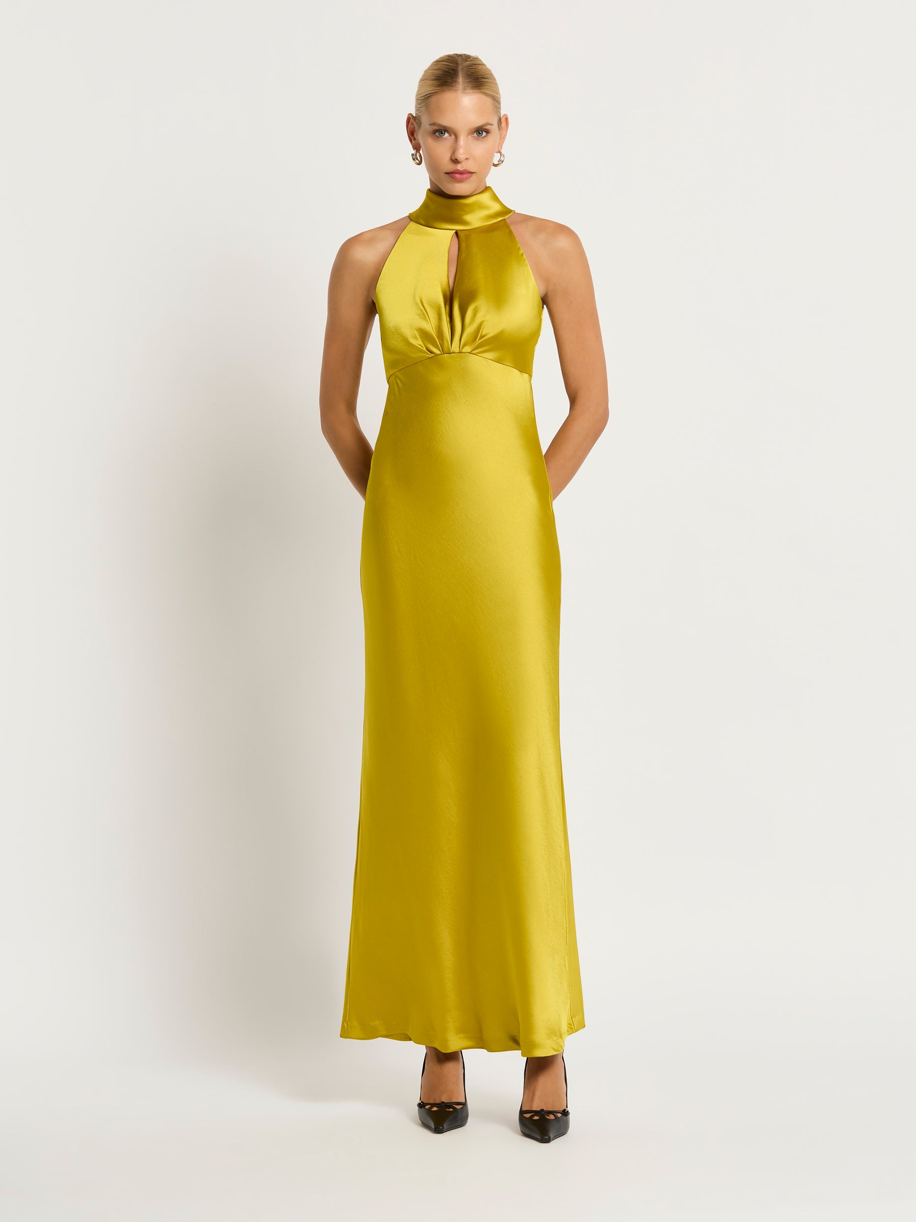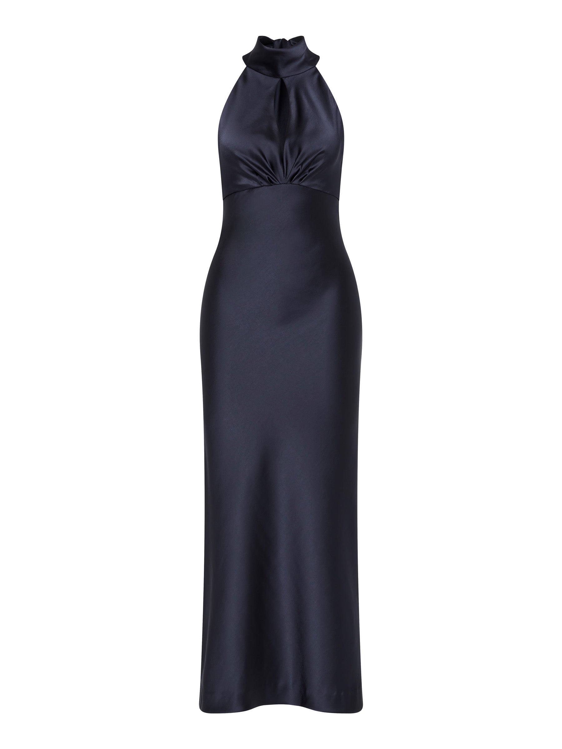 The rich midnight-navy sateen of the Nicola Gown creates a luxuriously elegant look for your next cocktail or black-tie event. Fitted through the bodice with an under bust seam and keyhole opening, the midweight sateen drapes beautifully to a full-length hem with a slight A-line silhouette. Long ties at the centre back add a unique style that makes this a stand-out gown that can be paired with designer shoes, gloves or other accessories.