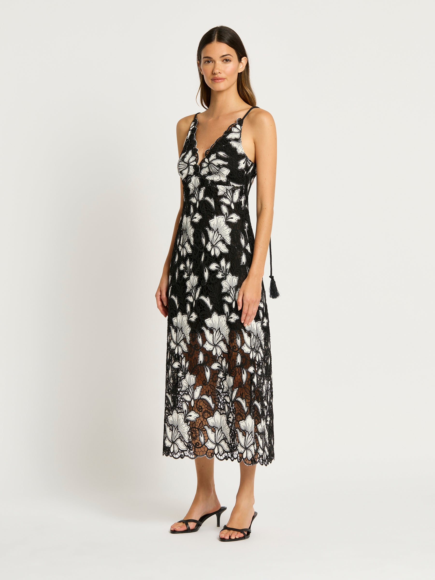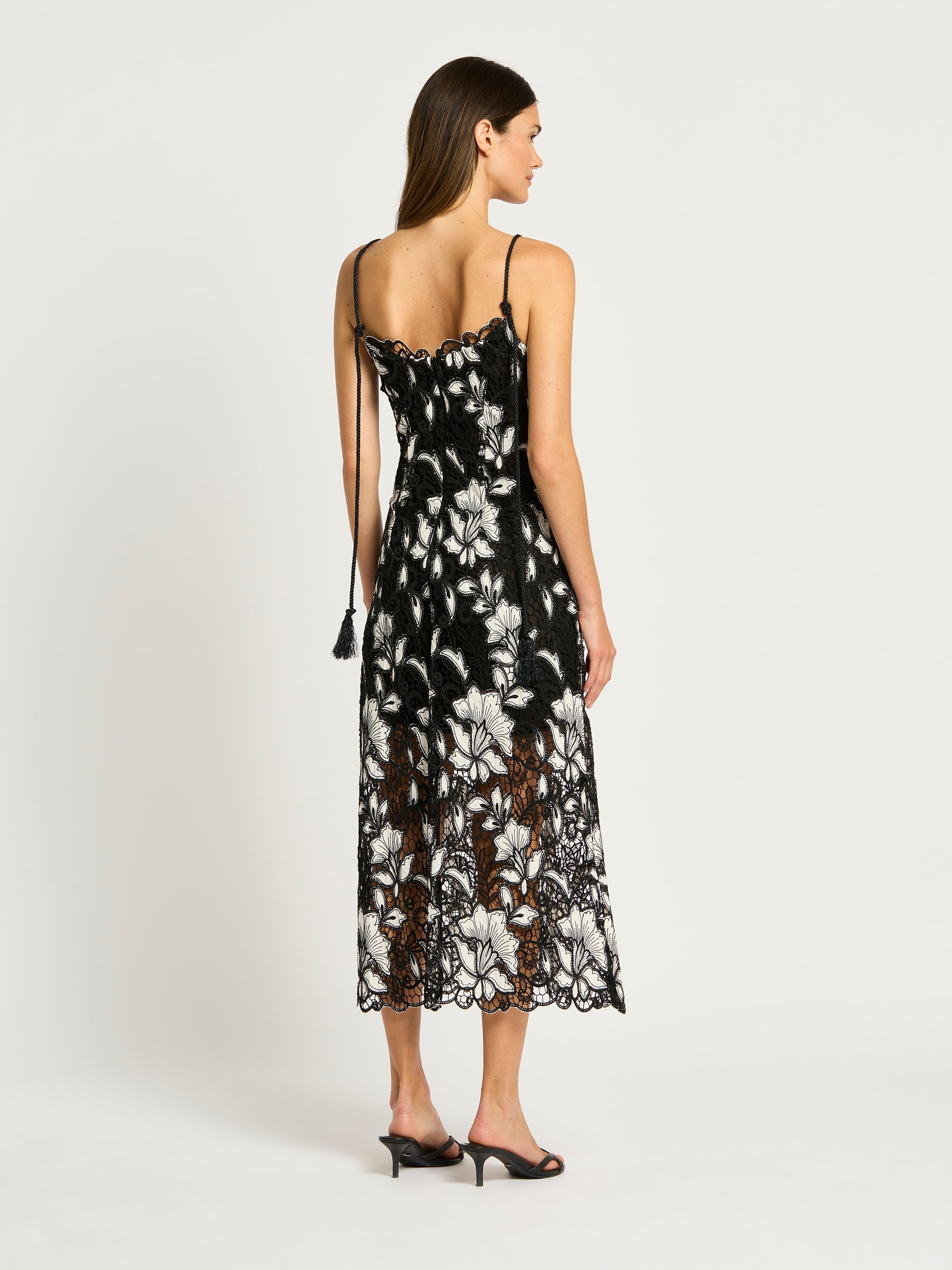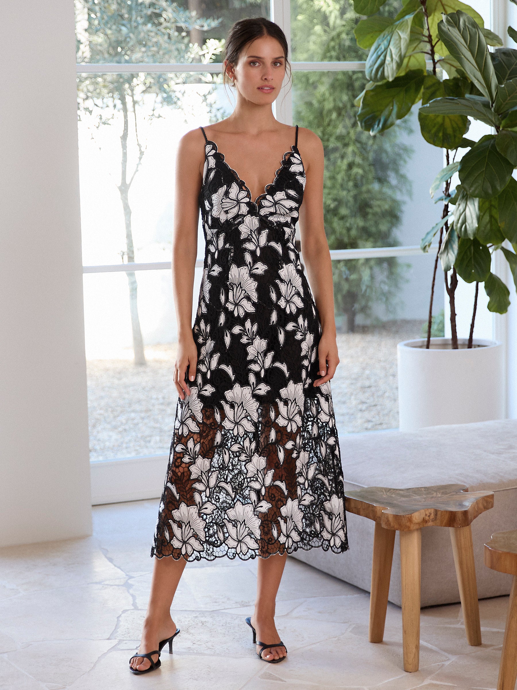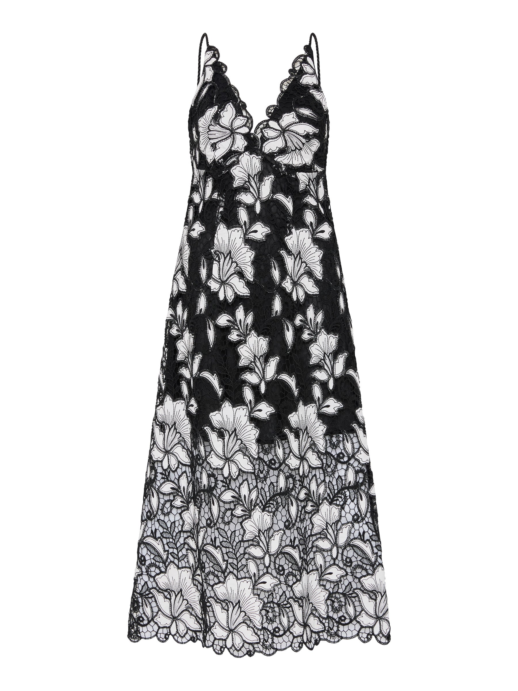 The elegant silhouette of the Iris Midi is crafted from a corded embroidered floral design on cotton. The scallop V- neck and bust embroidered detailing is intricately placed and the cord straps are designed to be adjustable. Fitted through the bodice and waist it falls to an A-line hem, finishing at mid-calf. Lined in a soft cotton voile the Iris Midi is the perfect dress for Races or Summer event.