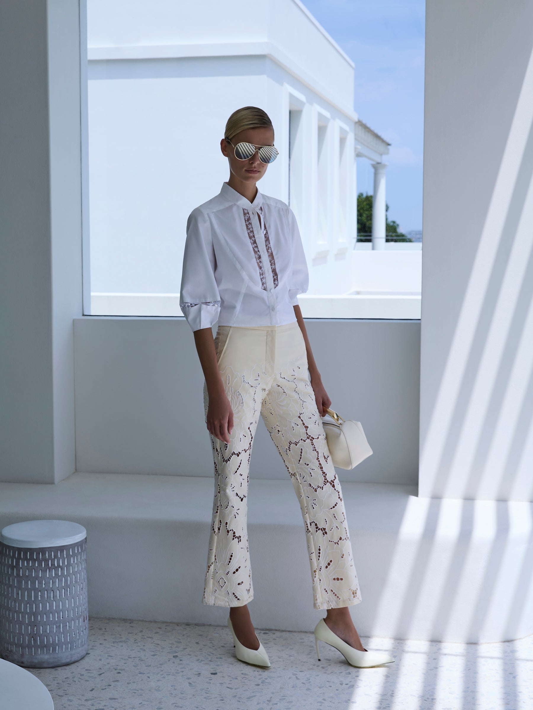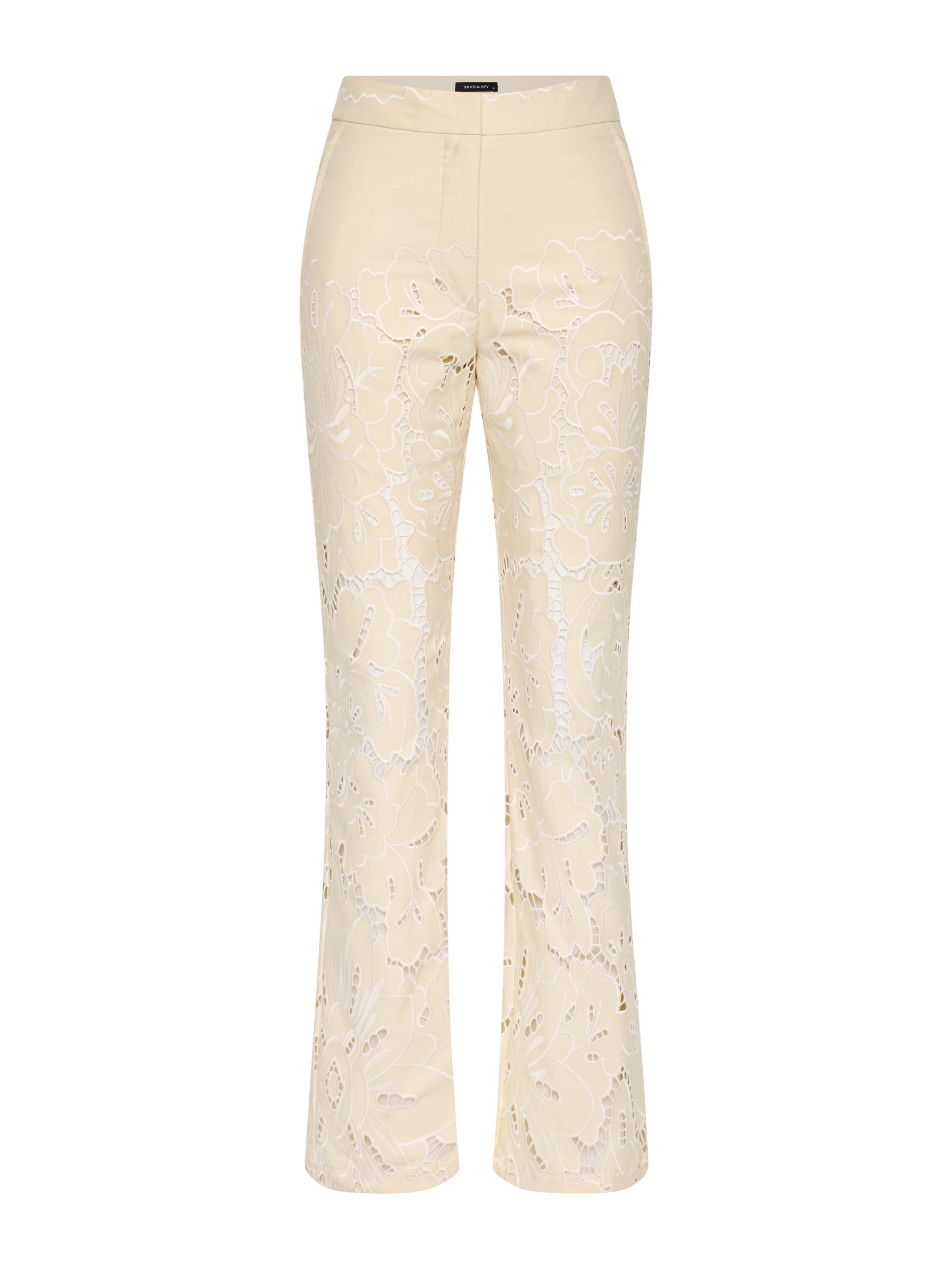 Tailored from a cut out embroidered cotton blend, the Colette Pant offers a refined yet contemporary silhouette. Fitted at the waist and through the hips, falling to a slightly flared hem and lined to mid-thigh in a stretch cotton. Designed to pair perfectly with the Colette Bustier and Colette Jacket.