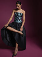 The Bella Bustier is a true statement piece, featuring a mint blue floral design with subtle metallic highlights, crafted on a contrasting black organza jacquard. This strapless bustier is fully lined and structured with boning through the bodice to create a fitted silhouette. Pair with the Rene Skirt for an effortlessly bold look, perfect for any cocktail event.