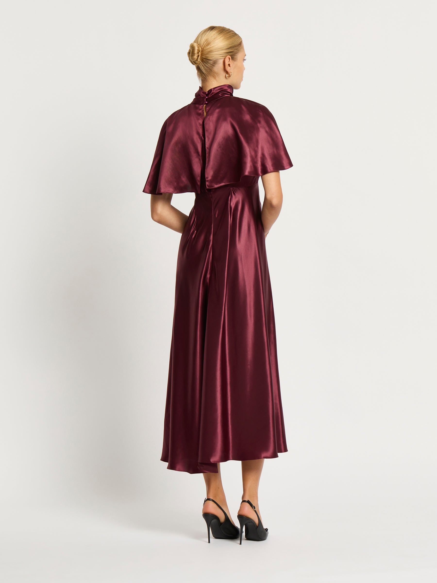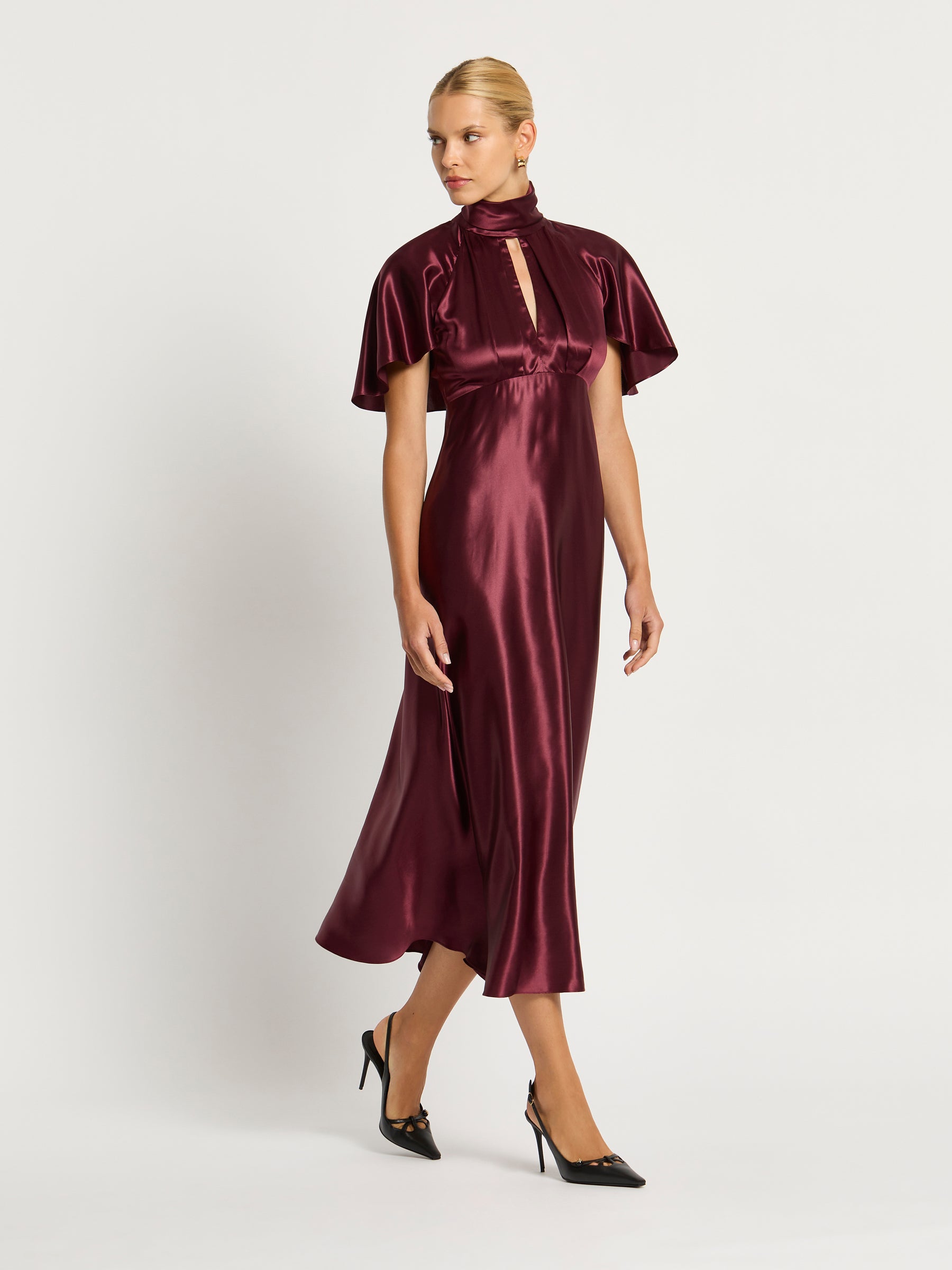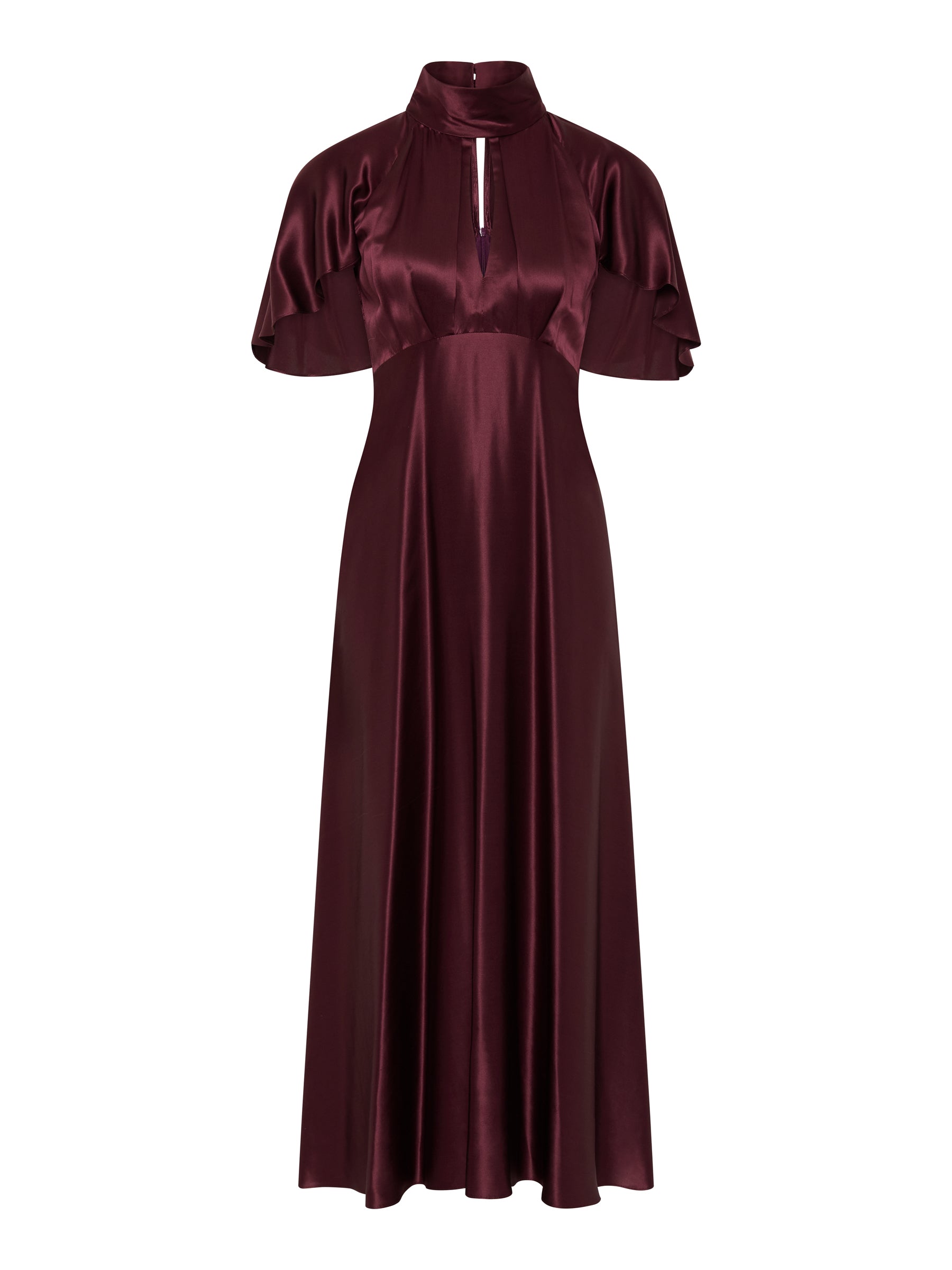 The silky, rich plum colour of the Eleanor Midi, its flowy cape sleeves and soft high neckline with a keyhole front opening, combine to create a distinctive look that will stand out at any cocktail party or special event. Fitted through the bodice with an under-bust-seam, and secured at centre back with button and loop fastenings, the silk blend falls beautifully to an A-line flowy skirt, finishing mid-calf.