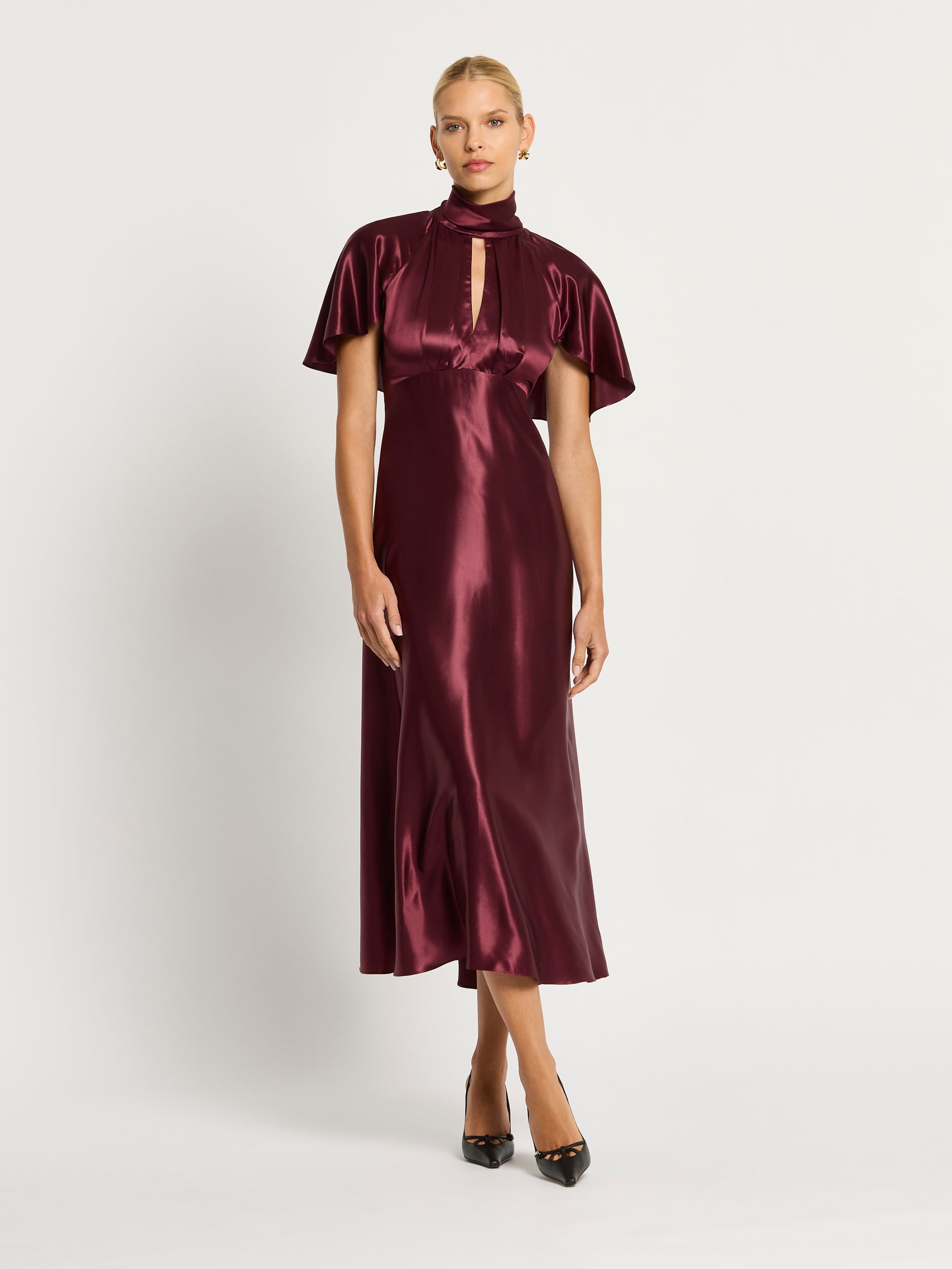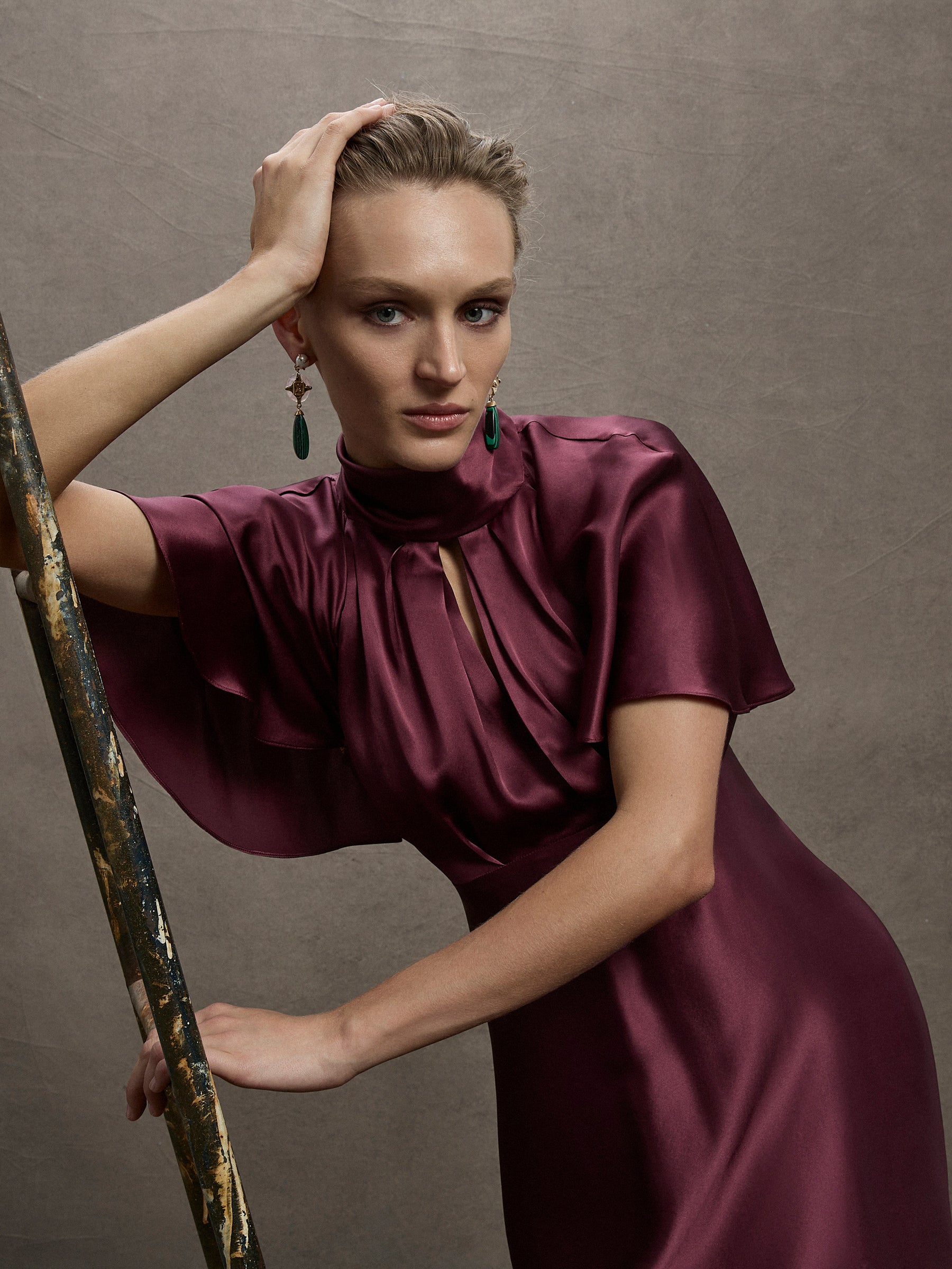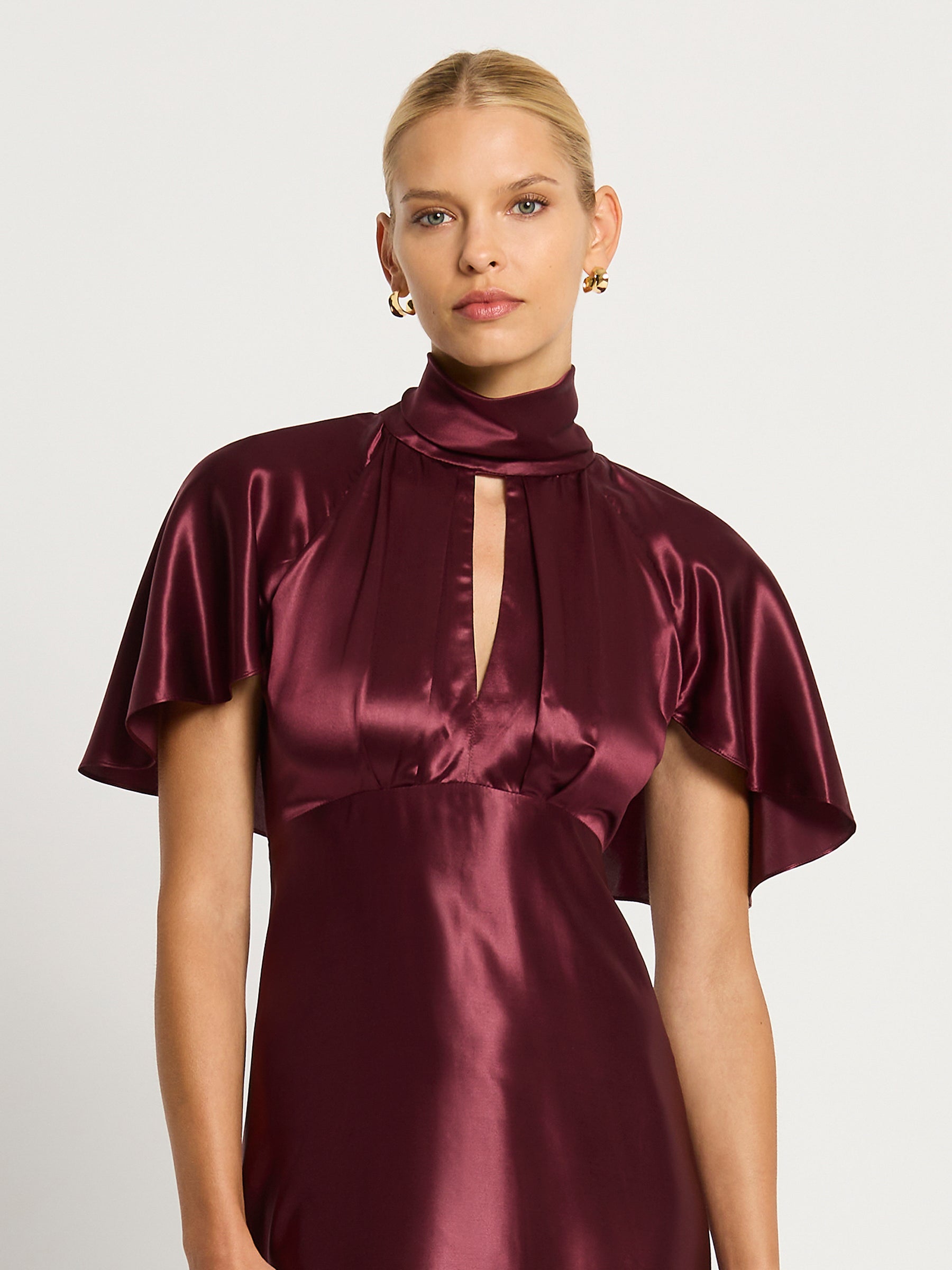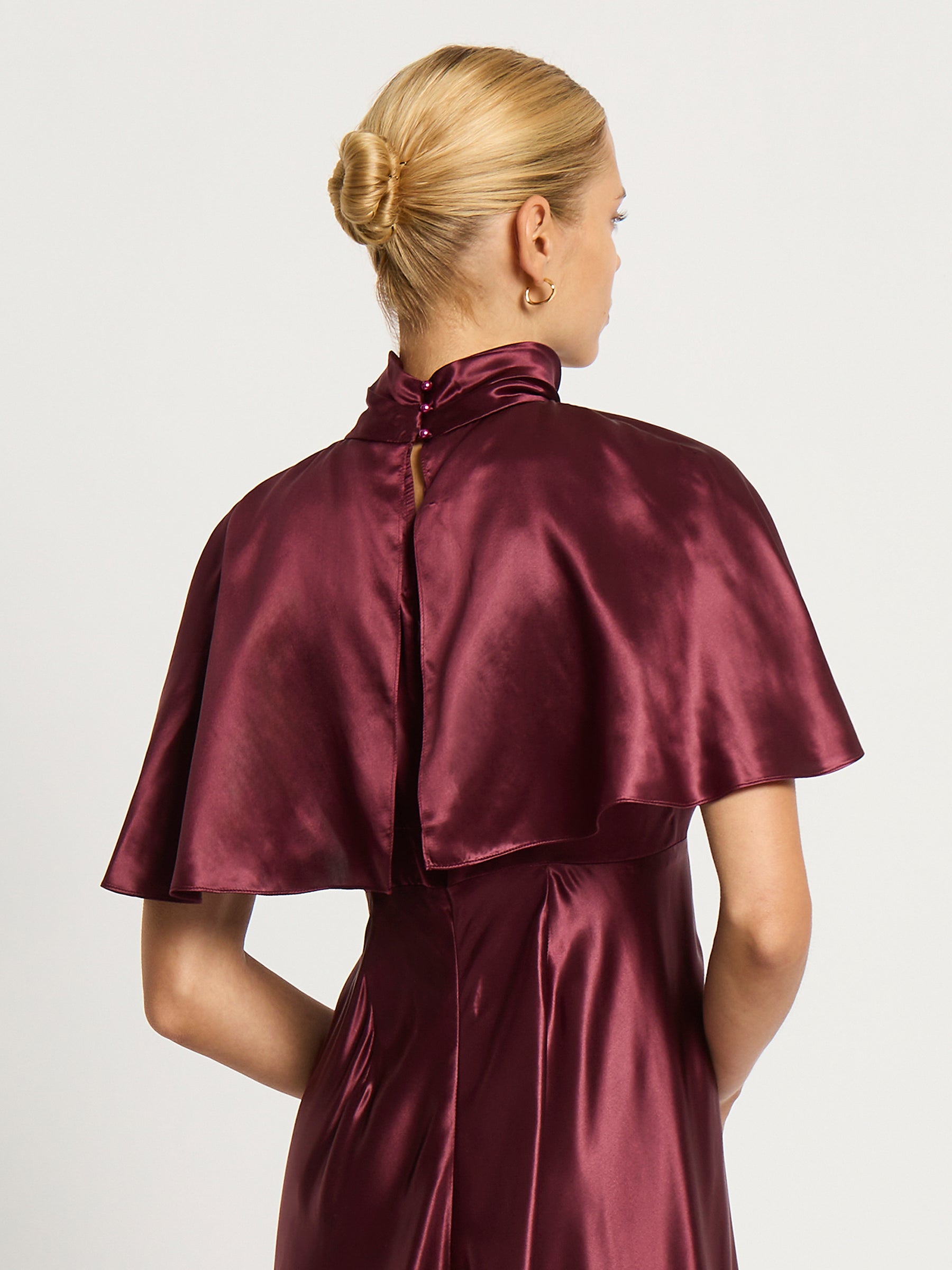The silky, rich plum colour of the Eleanor Midi, its flowy cape sleeves and soft high neckline with a keyhole front opening, combine to create a distinctive look that will stand out at any cocktail party or special event. Fitted through the bodice with an under-bust-seam, and secured at centre back with button and loop fastenings, the silk blend falls beautifully to an A-line flowy skirt, finishing mid-calf.