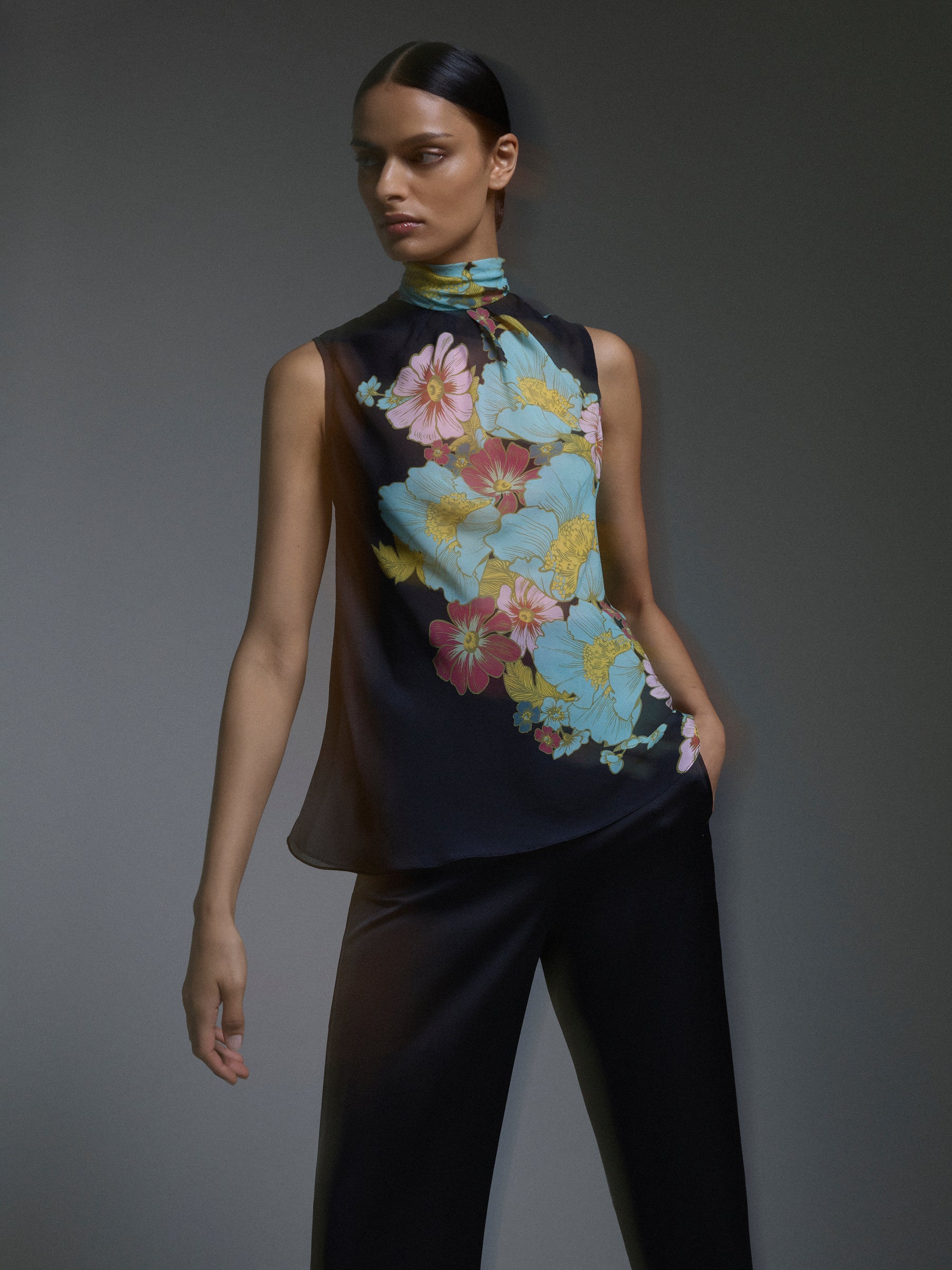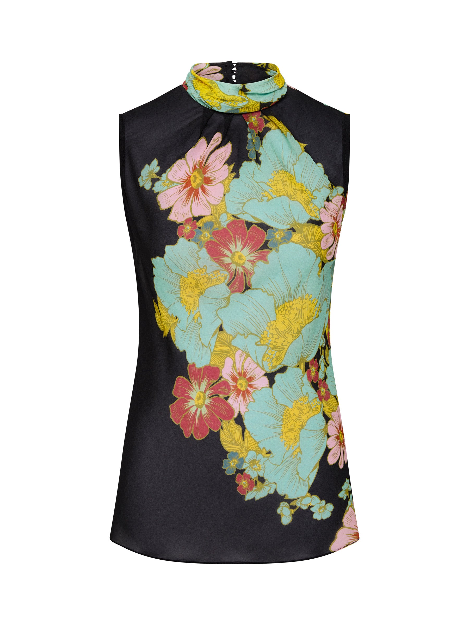The Julia Top is a versatile staple for your wardrobe. Crafted from a soft drapey viscose georgette with a large placement floral print in mint, ruby pink and yellow flowers on a striking black background, meticulously placed to flatter the body. Features a sleeveless design with a high draped collar and loop and button closure at centre back.