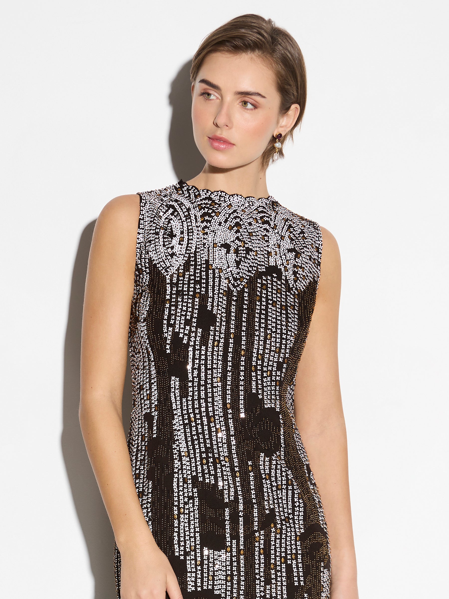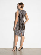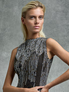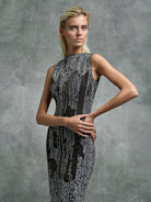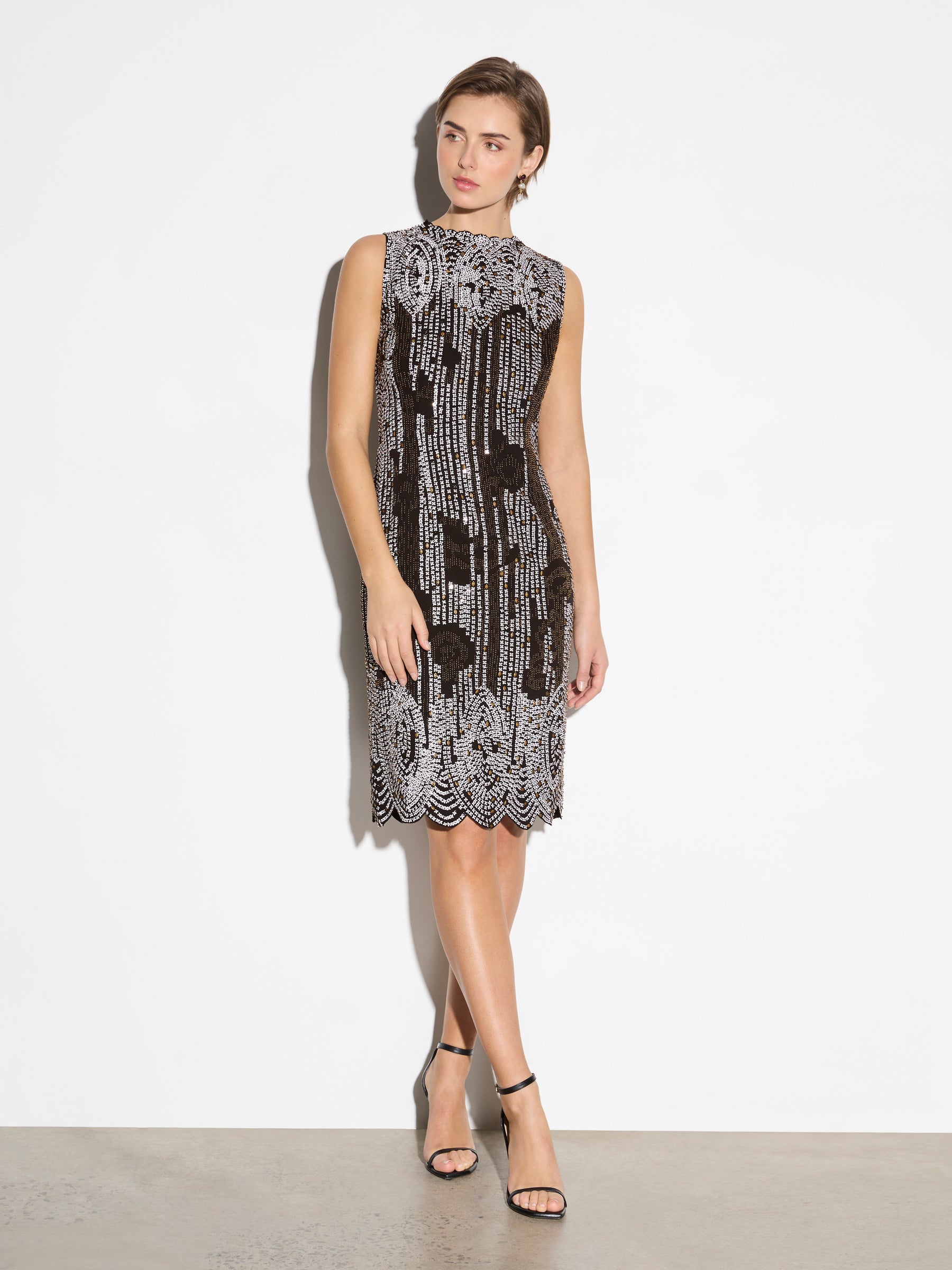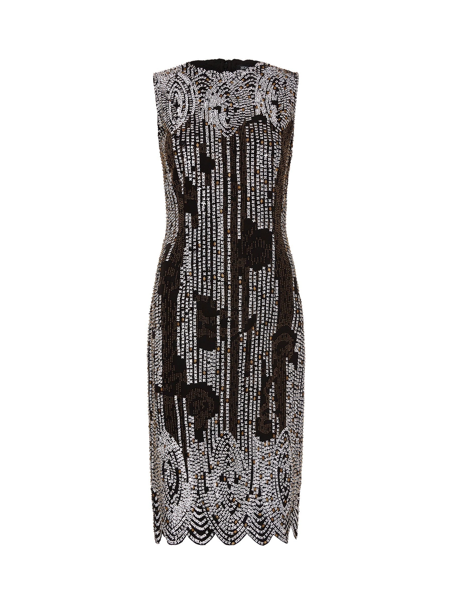 The Royale Shift is a heavily embellished shift dress with an intricate floral hand beaded design done by talented Indian artisans. The sleeveless silhouette is complete with a blend of gold, black and white beading making the dress a real eye-catching stand out piece whilst still maintaining its sophisticated style. The Royale Shift finishes just above the knee and features a small centre back split and scallop hemline making it the perfect dress for your cocktail events.